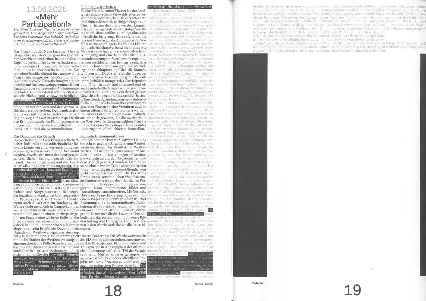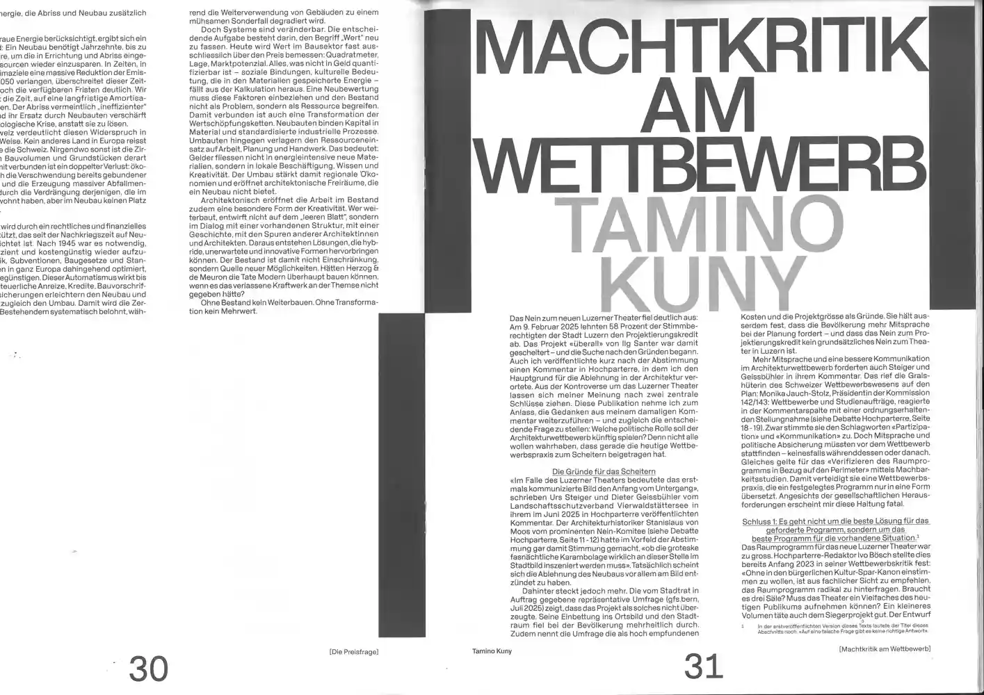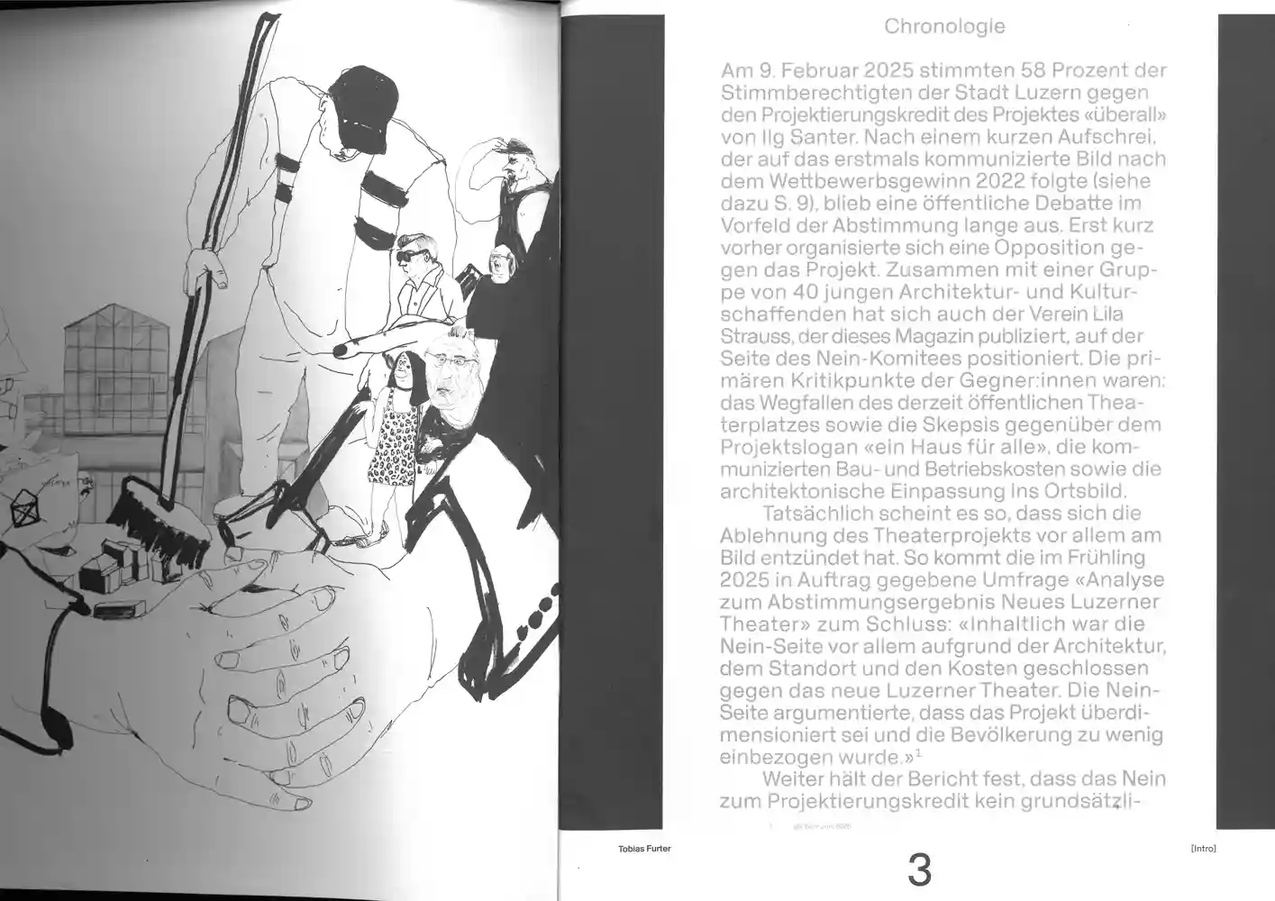 Am 9. Februar 2025 stimmten 58 Prozent der Stimmberechtigten der Stadt Luzern gegen den Projektierungskredit des Projektes «überall» von Ilg Santer. Nach einem kurzen Aufschrei, der auf das erstmals kommunizierte Bild nach dem Wettbewerbsgewinn 2022 folgte (siehe dazu Seite: xx), blieb eine öffentliche Debatte im Vorfeld der Abstimmung lange aus. Erst kurz vor der Abstimmung organisierte sich eine Opposition gegen das Projekt. Zusammen mit einer Gruppe von 40 jungen Architektur- und Kulturschaffenden hat sich auch der Verein Lila Strauss, der dieses Magazin publiziert, auf der Seite des Nein-Komitees positioniert. Die primären Kritikpunkte der Gegner:innen waren: das Wegfallen des derzeit öffentlichen Theaterplatzes sowie die Skepsis gegenüber dem Projektslogan «ein Haus für alle», die kommunizierten Bau- und Betriebskosten sowie die architektonische Einpassung ins Ortsbild.