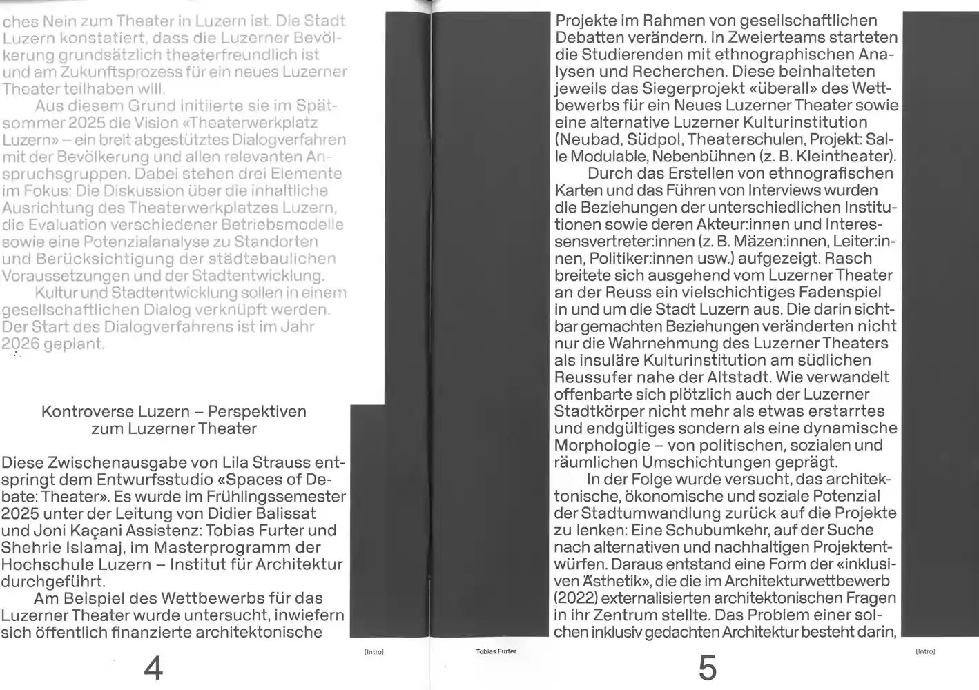Das Ziel dieser Ausgabe ist es, die Debatte, die das Luzerner Theater auch zukünftig begleiten und auslösen soll, assoziativ, induktiv und vor allem positiv zu erweitern und anzuregen. Gleichzeitig verortet sie die Institution des Luzerner Theaters im politisch und räumlich dynamischen Stadtkörper von Luzern – dessen Spiegelbild sie sein muss.