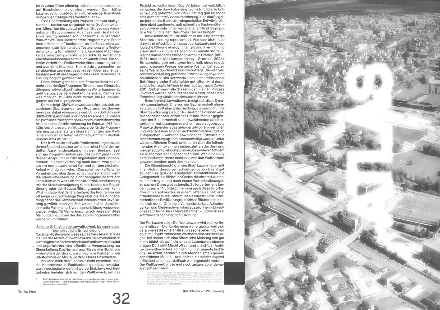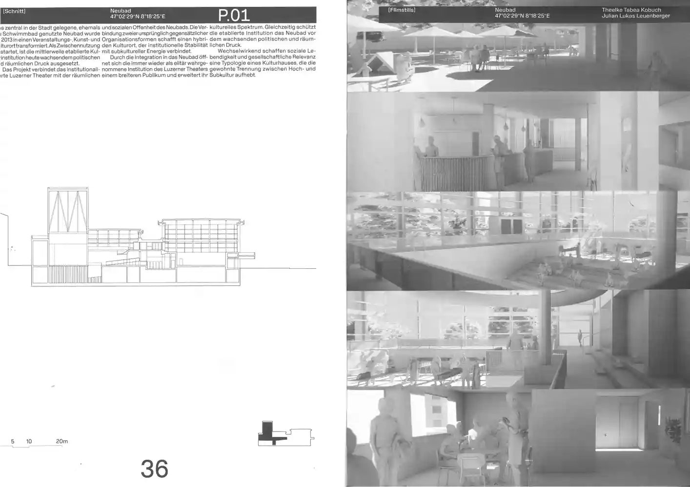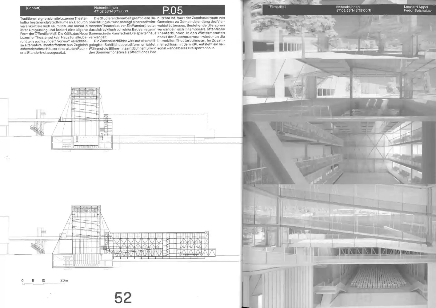 Am Beispiel des Wettbewerbs für das Luzerner Theater wurde untersucht, inwiefern sich öffentlich finanzierte architektonische Projekte im Rahmen von gesellschaftlichen Debatten verändern. In Zweierteams starteten die Studierenden mit unterschiedlichen ethnographischen Analysen und Recherchen. Diese beinhalteten jeweils das Siegerprojekt «überall» des Wettbewerbs für ein Neues Luzerner Theater sowie eine alternative Luzerner Kulturinstitution (Neubad, Südpol, Theaterschulen, Projekt: Salle Modulable, Nebenbühnen (z. B. Kleintheater).