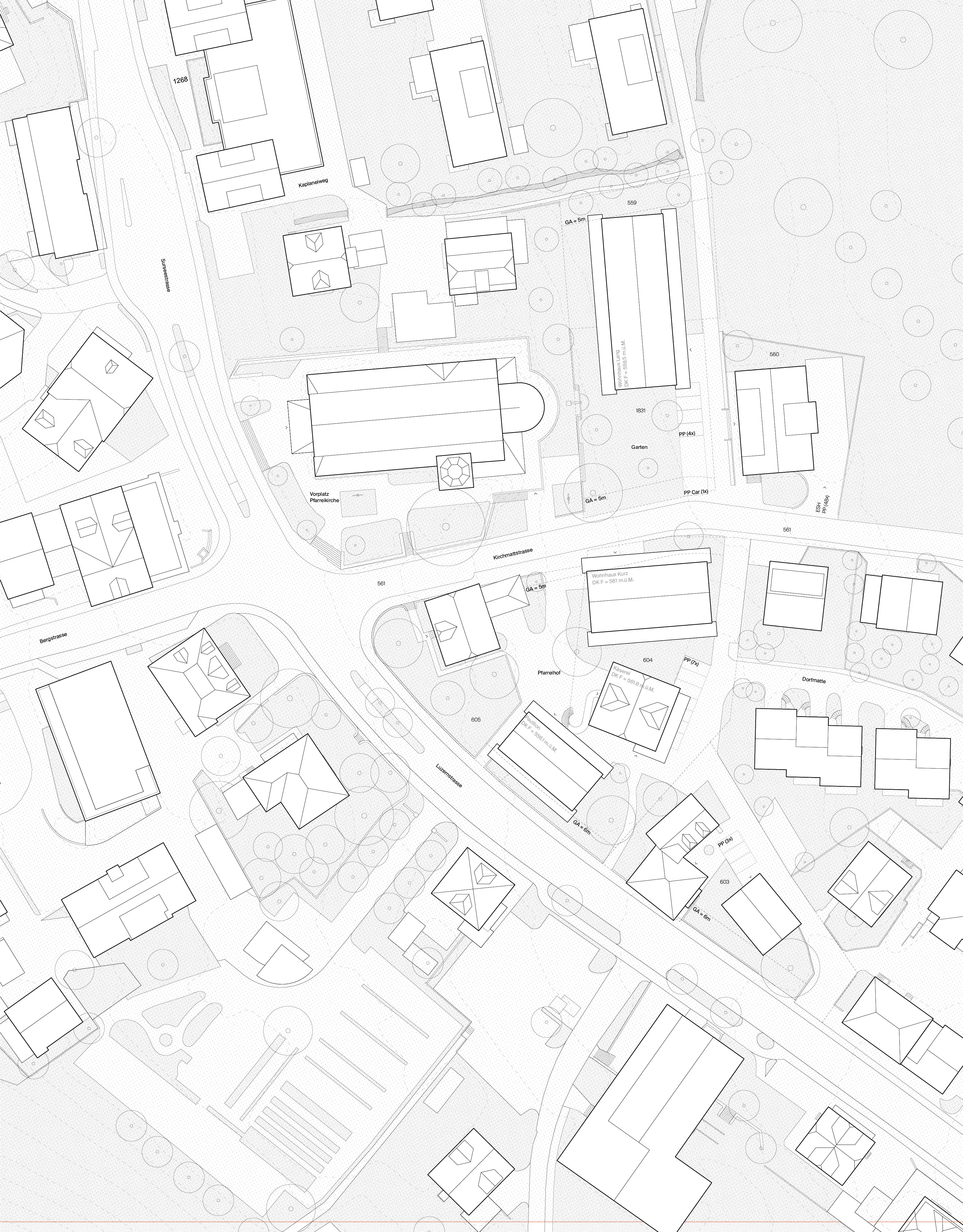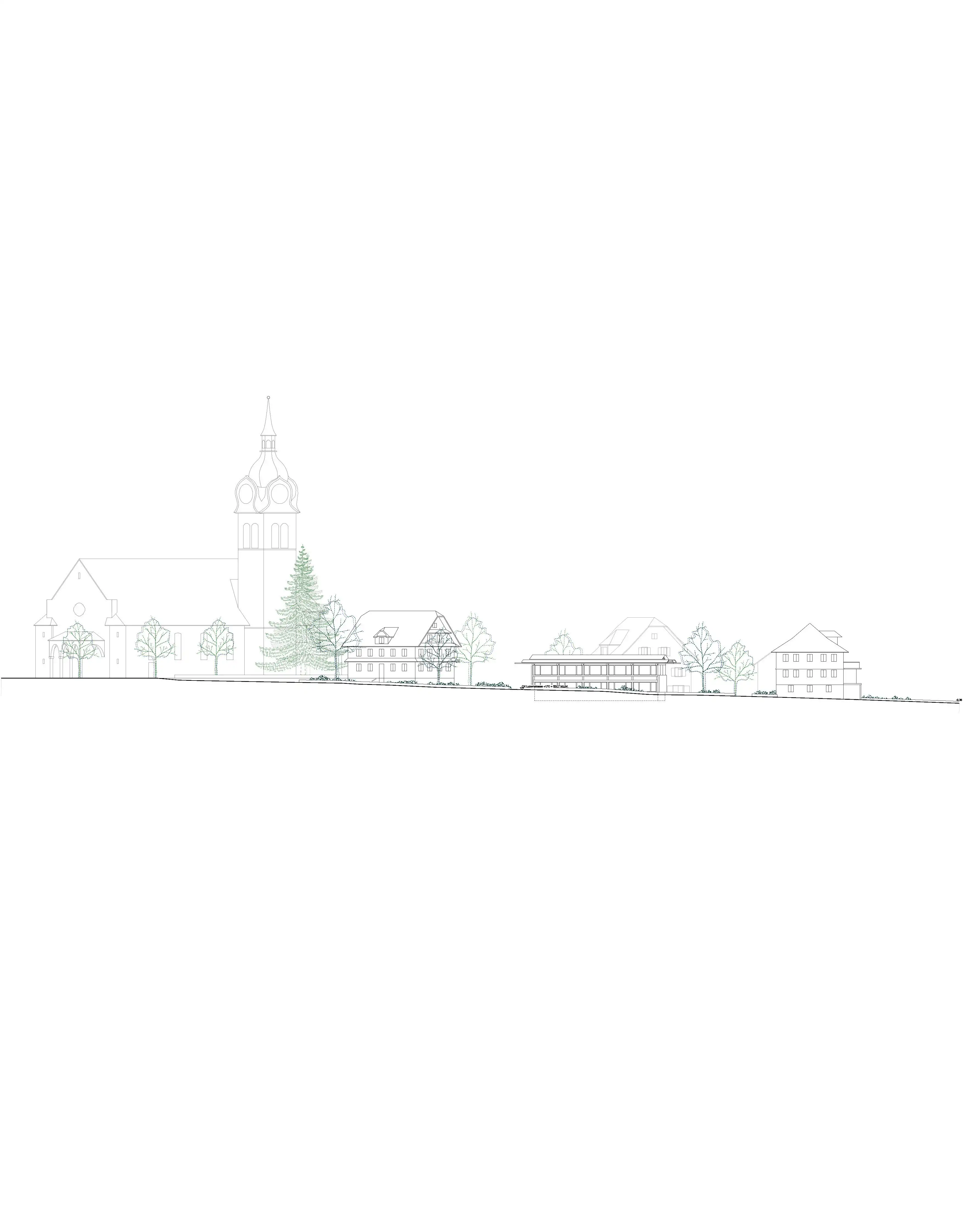 Das Projekt versucht an die vielschichten historischen Beziehungen anzuknüpfen. Als Inspiration dient ein Aquarell des ortsansässigen Landschaftsmaler Mauriz Rast (1838-1902). Wie in der Darstellung von Rast verwandelt der Projektvorschlag das Dorfzentrum von Neuenkirch in einen malerischen Landschaftsraum, in dem sich Bestands- und Neubauten in lockerer Ordnung einfügen.