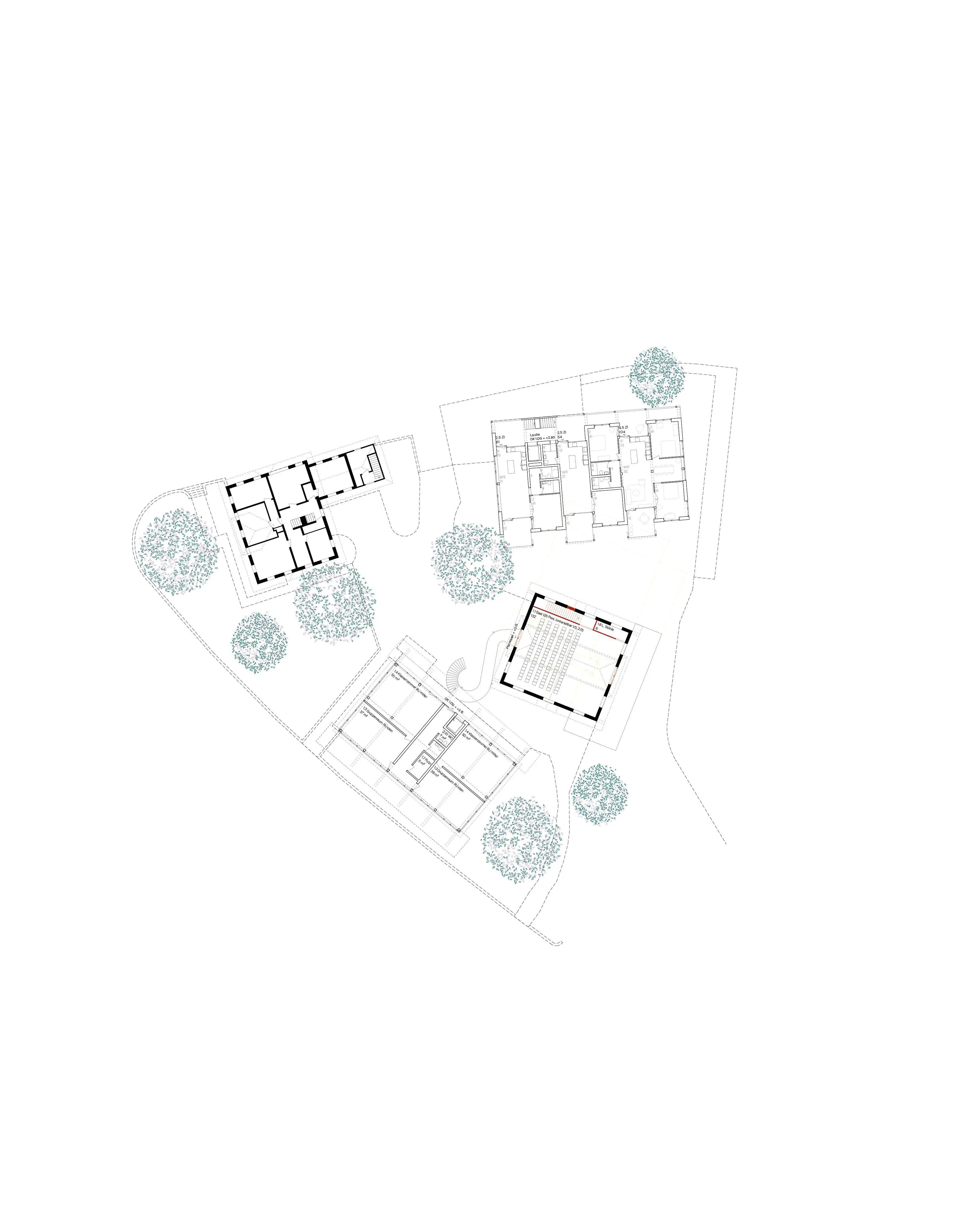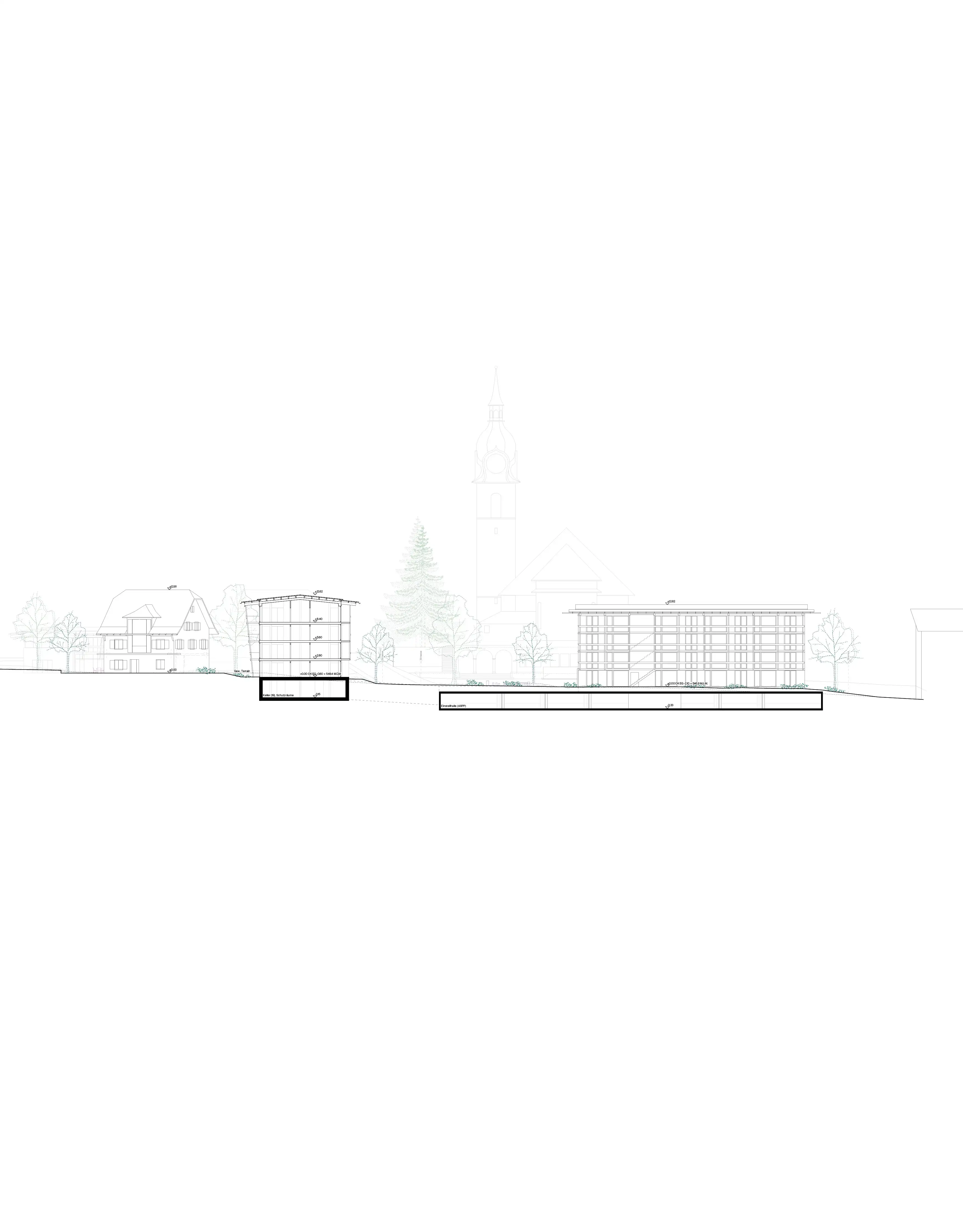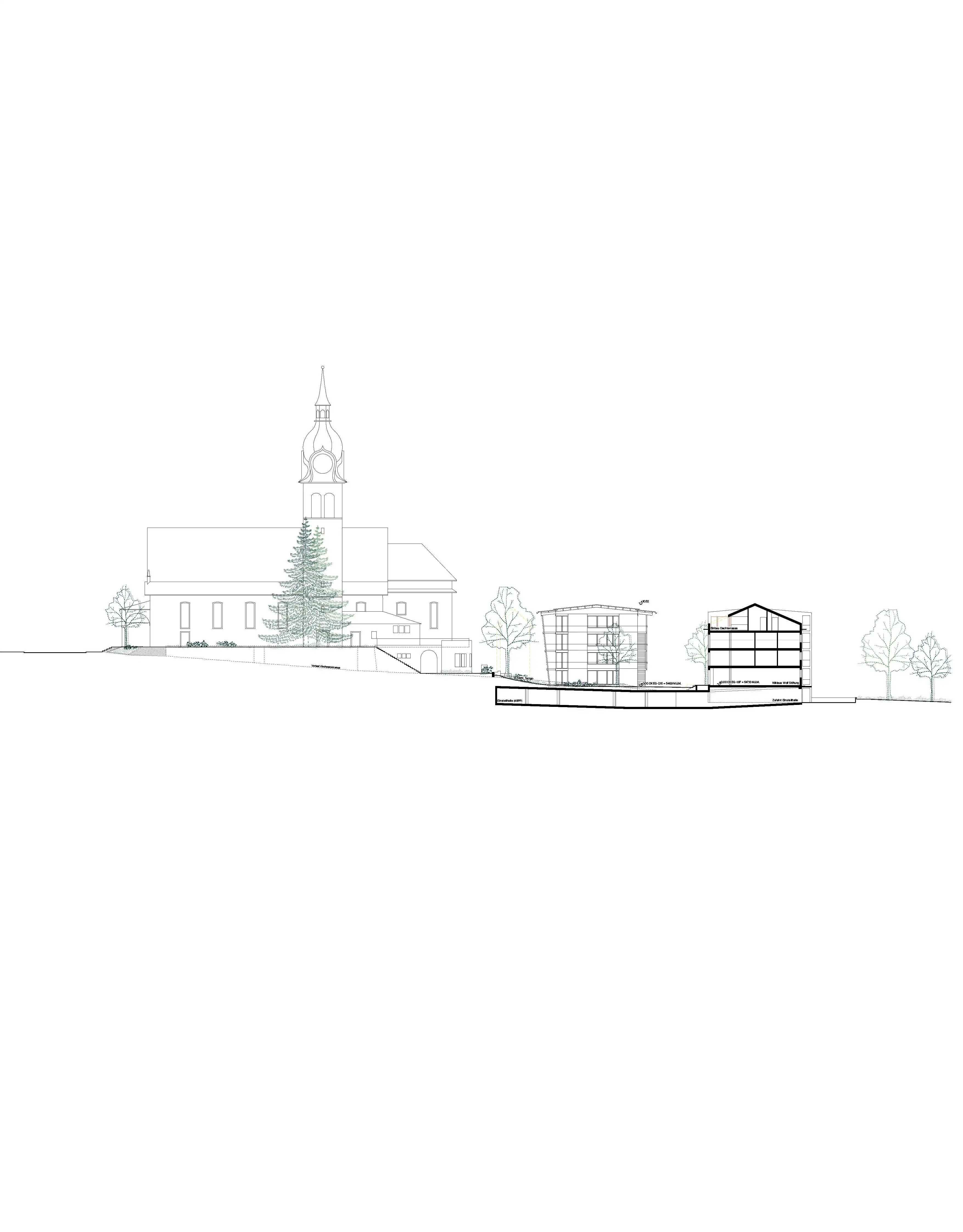 Die bestehende «liberale Käserei» bleibt erhalten und wird vom nordseitigen Anbau befreit. Im ersten Obergeschoss entsteht ein dreigeschossiger Raum für den der Pfarreisaal, im Erdgeschoss befinden sich künftig das Foyer und ein Jugendraum.