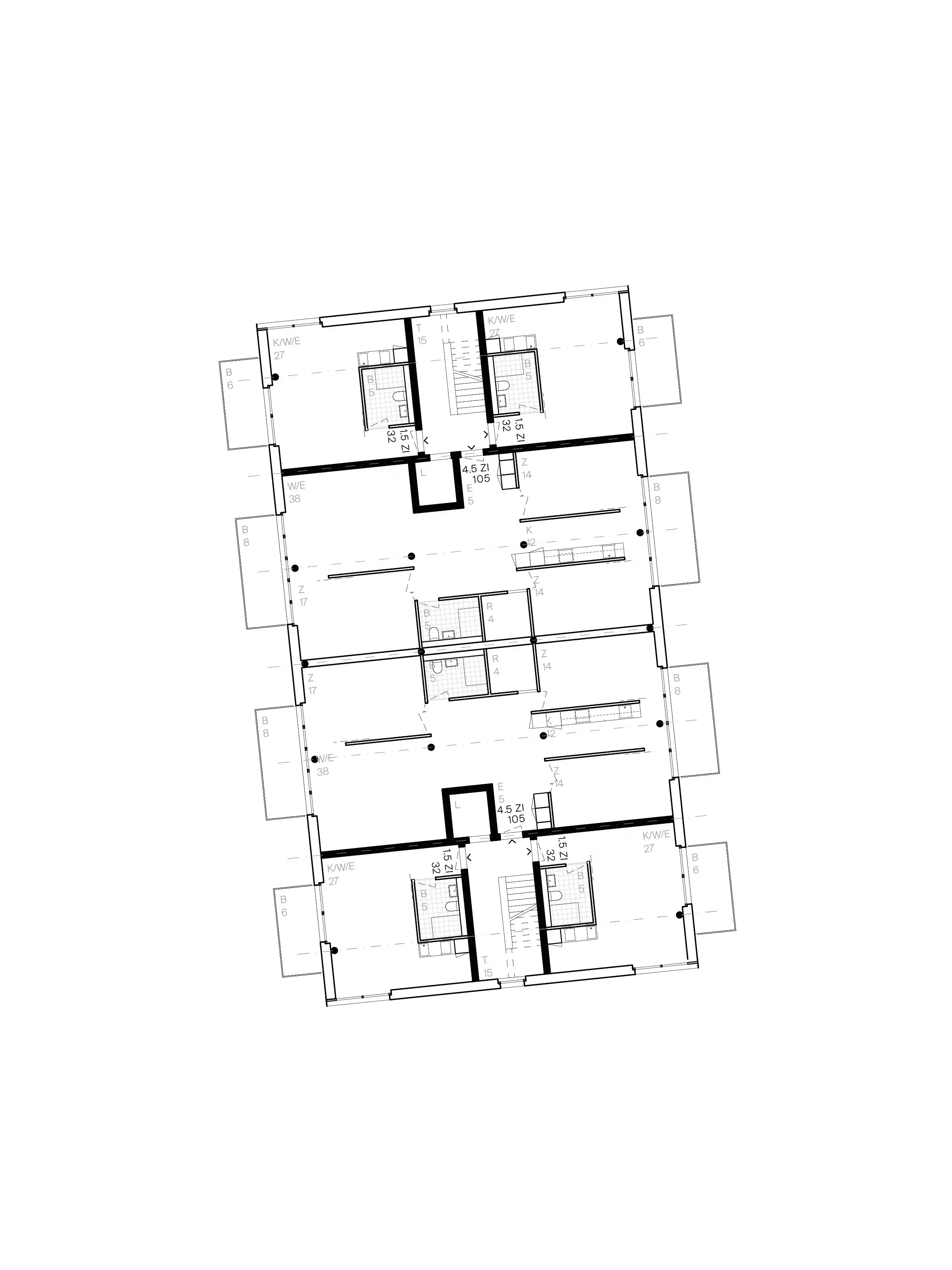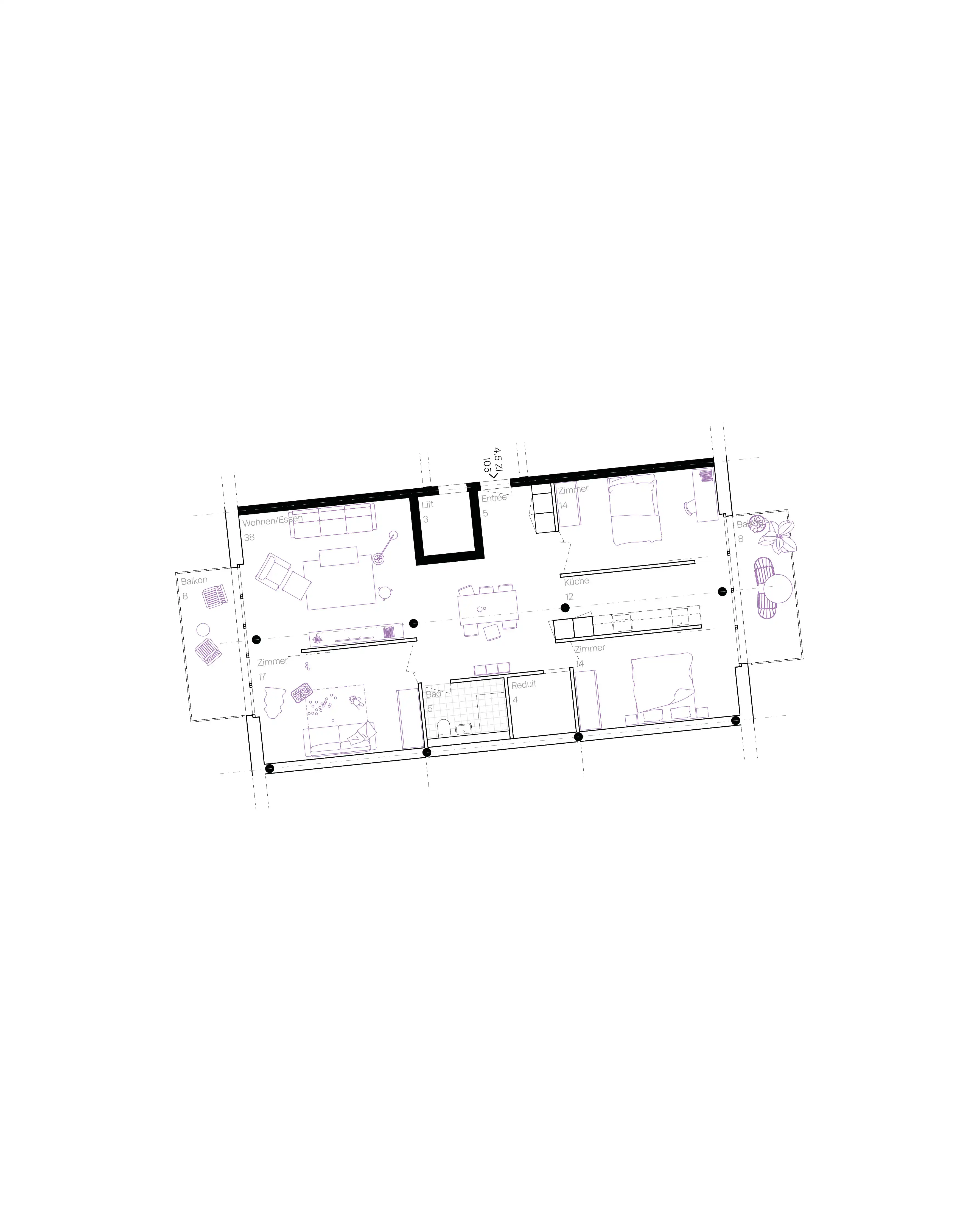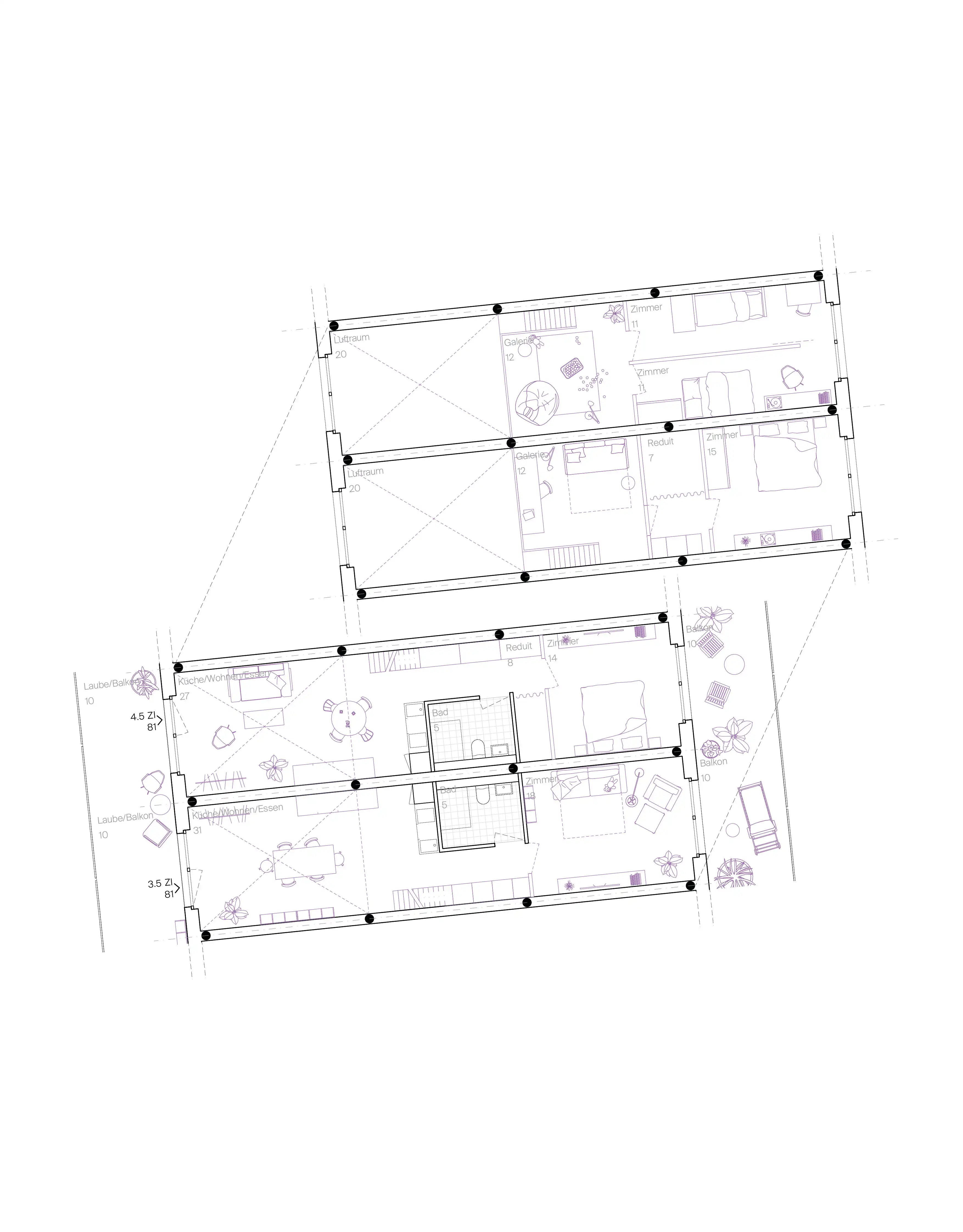 Diese wird in diesem Projekt als flexible Bühne verstanden, auf welcher sich die Mieter:innen durch «Hands-on–Partizipation» selbst einrichten können. In den unteren zwei Geschossen befinden sich nur mit notwendigster Infrastruktur ausgestattete, doppelgeschossige Wohnhallen. Sie können im Selbstbauprinzip zu einer 3.5-4.5 Zimmerwohnung ausgebaut werden. In den oberen Geschossen bietet eine sehr flexible und mehrdeutige Grundrissfigur unterschiedlichsten Lebensformen Platz.