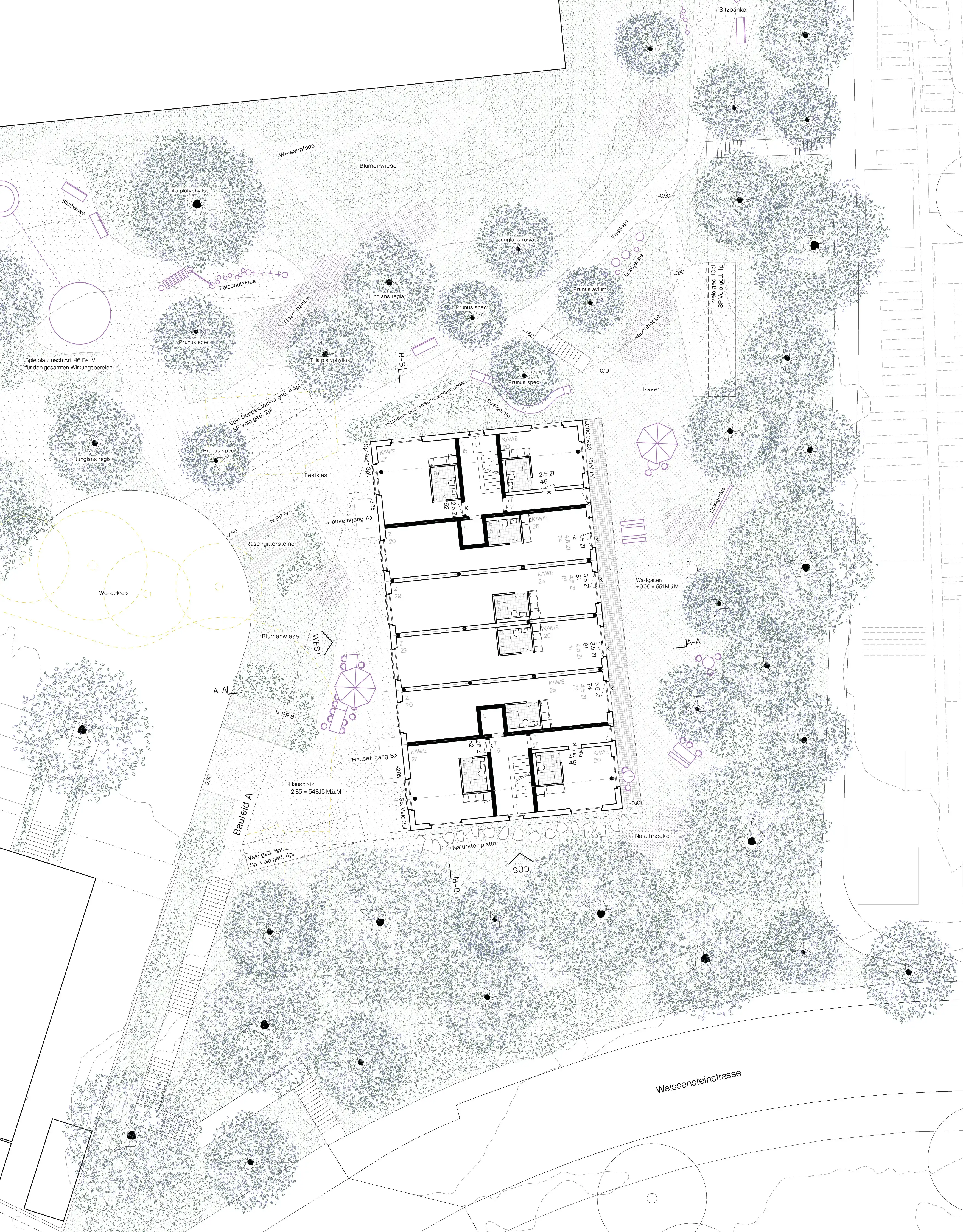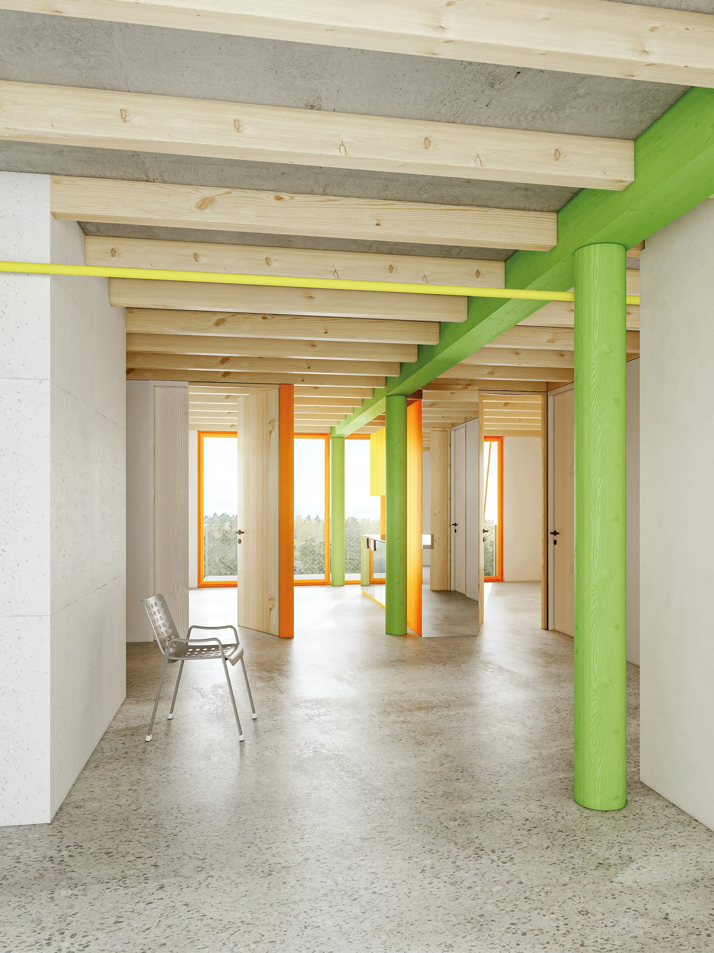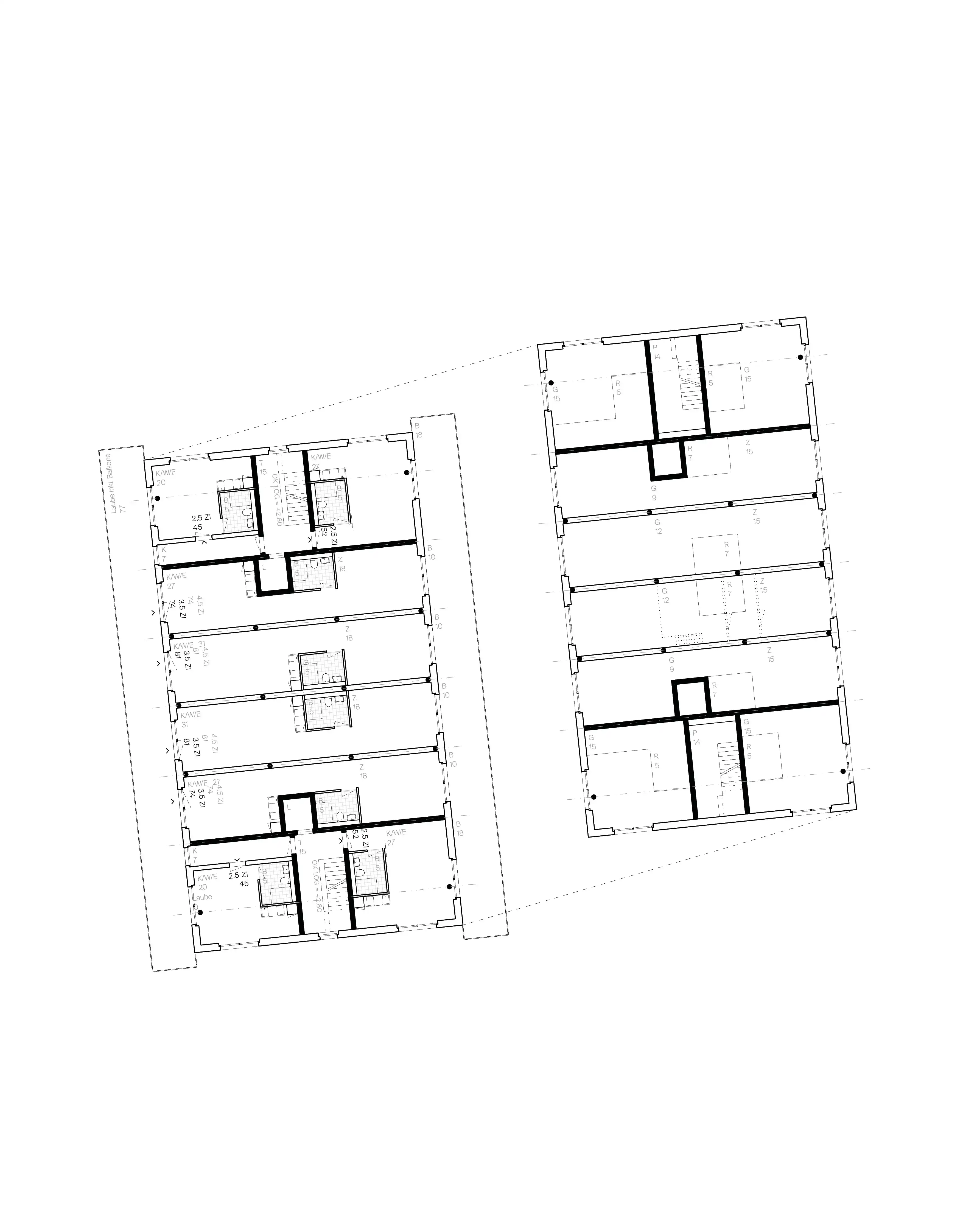 Diese wird in diesem Projekt als flexible Bühne verstanden, auf welcher sich die Mieter:innen durch «Hands-on–Partizipation» selbst einrichten können. In den unteren zwei Geschossen befinden sich nur mit notwendigster Infrastruktur ausgestattete, doppelgeschossige Wohnhallen. Sie können im Selbstbauprinzip zu einer 3.5-4.5 Zimmerwohnung ausgebaut werden. In den oberen Geschossen bietet eine sehr flexible und mehrdeutige Grundrissfigur unterschiedlichsten Lebensformen Platz.