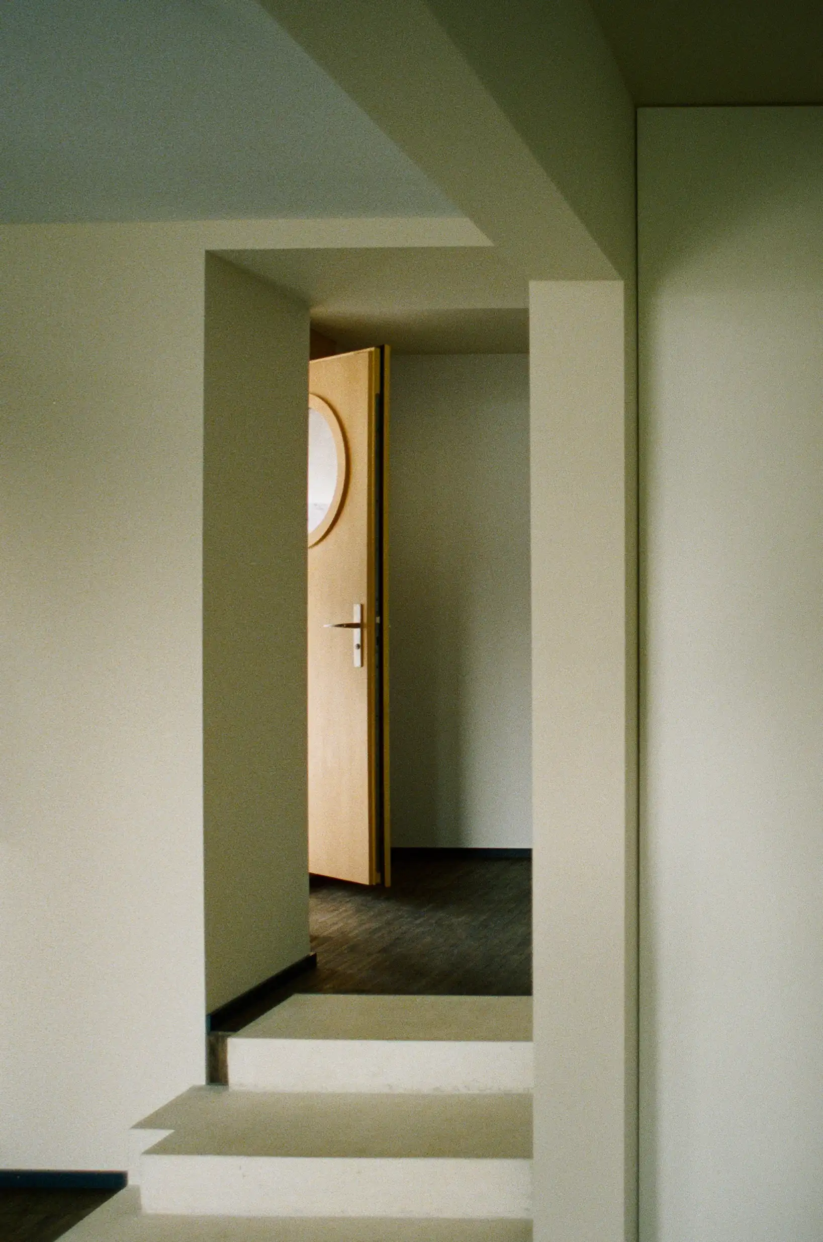 Die klassische Raumkonzeption von Boden, Wand und Decke wird im Innern des Hauses aufgelöst. Blaue und beige Farbflächen, sowie der schwarz gebeizte Holzboden werden frei arrangiert. So entsteht eine dynamische, situative Raumwirkung.