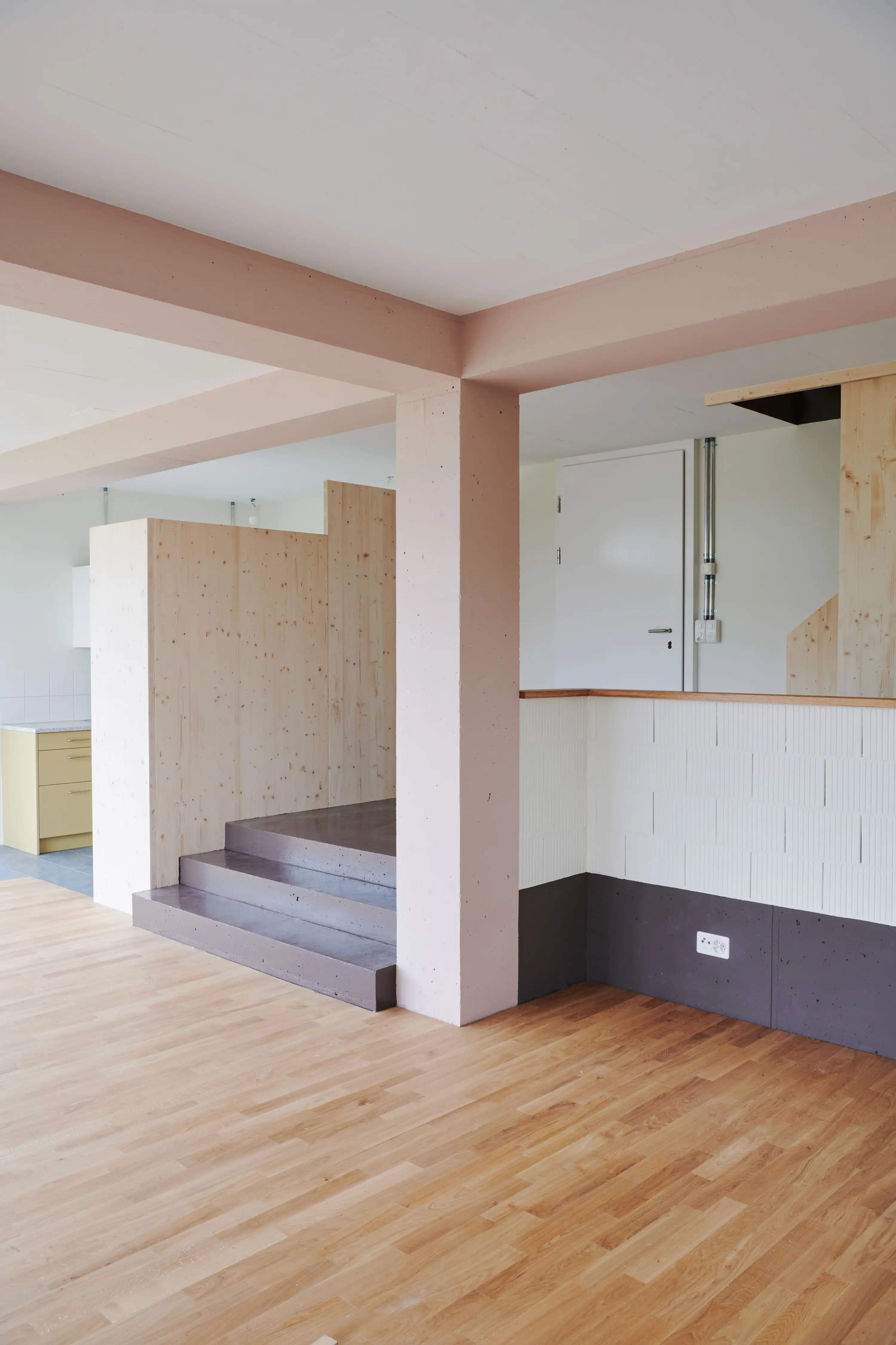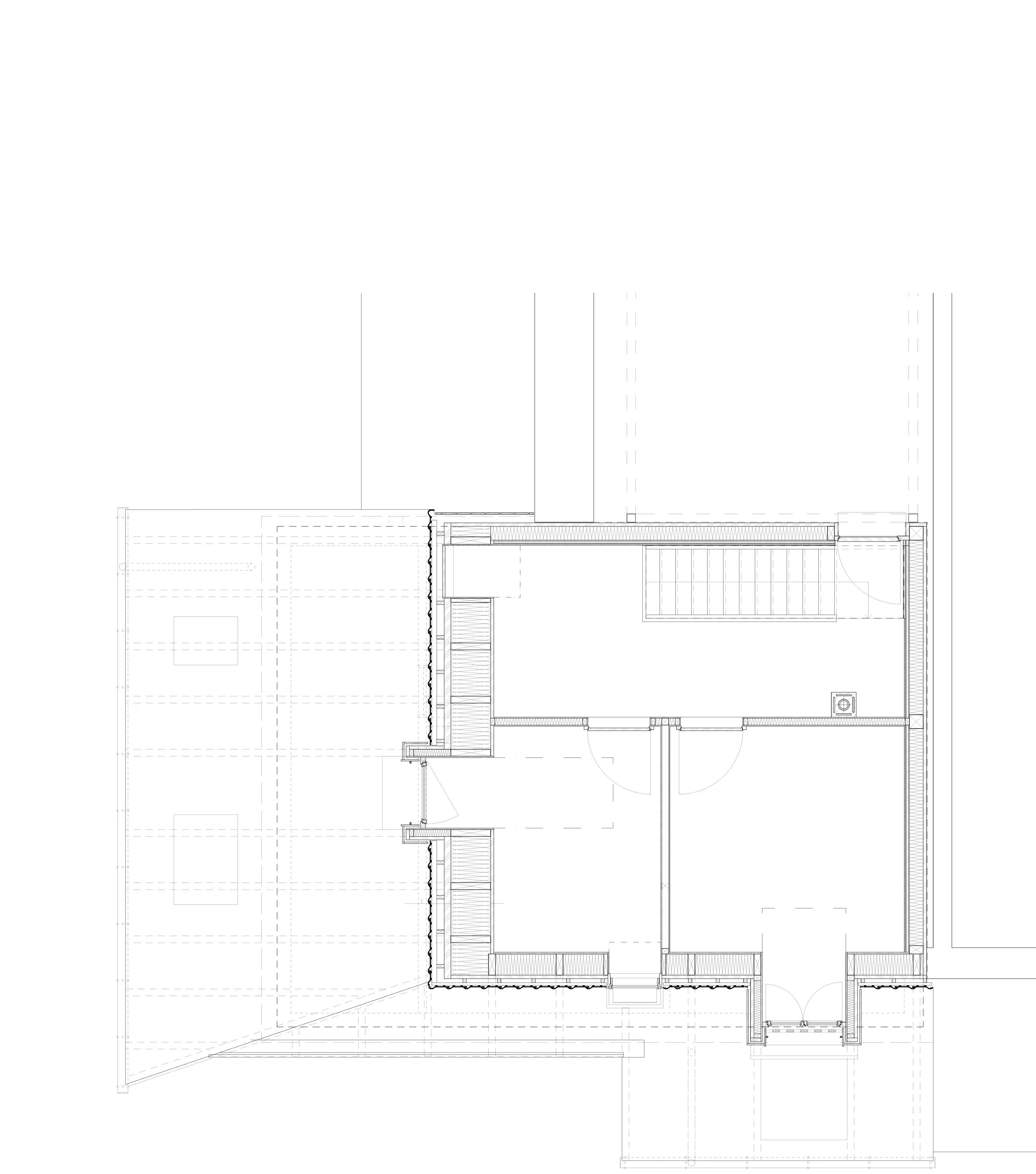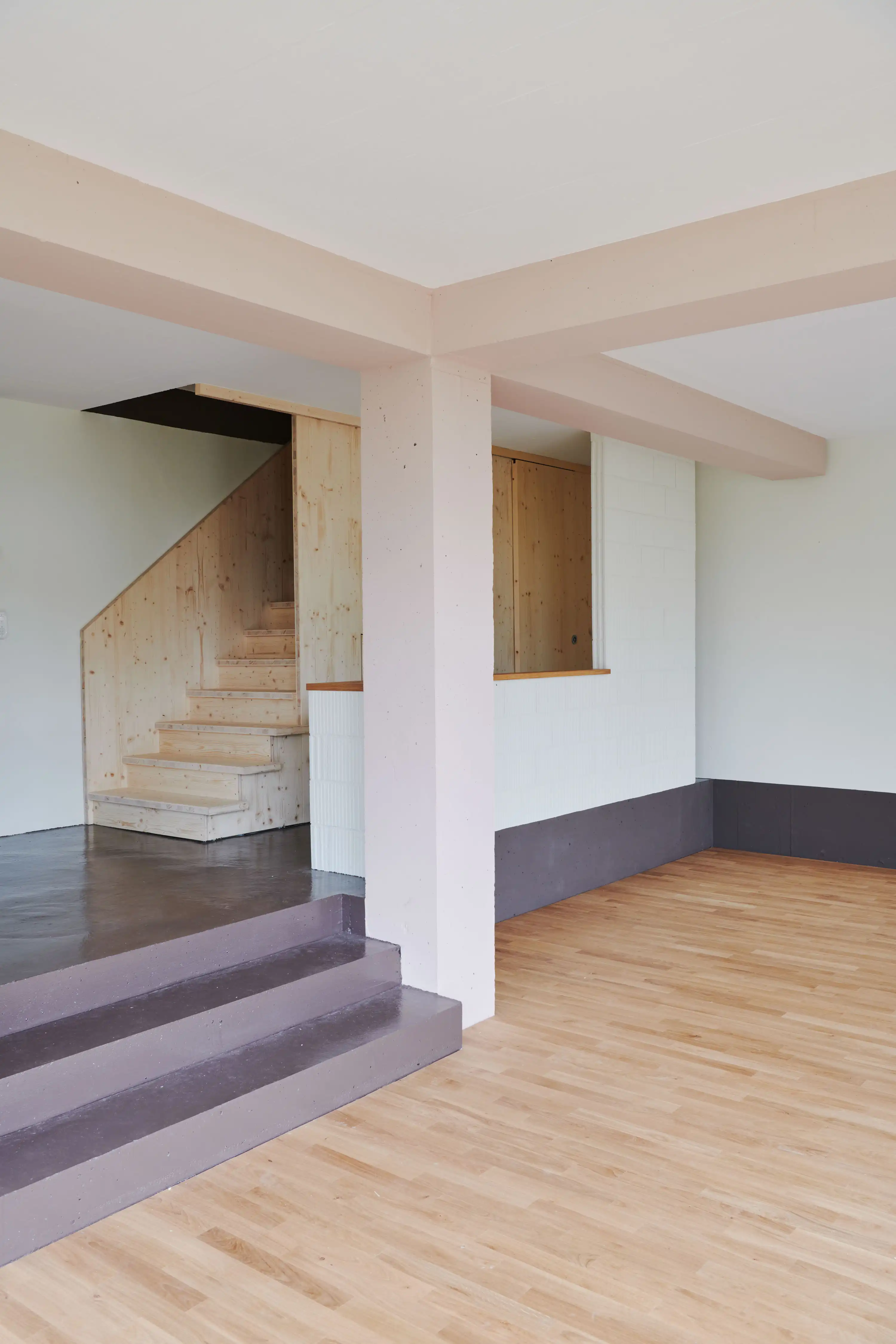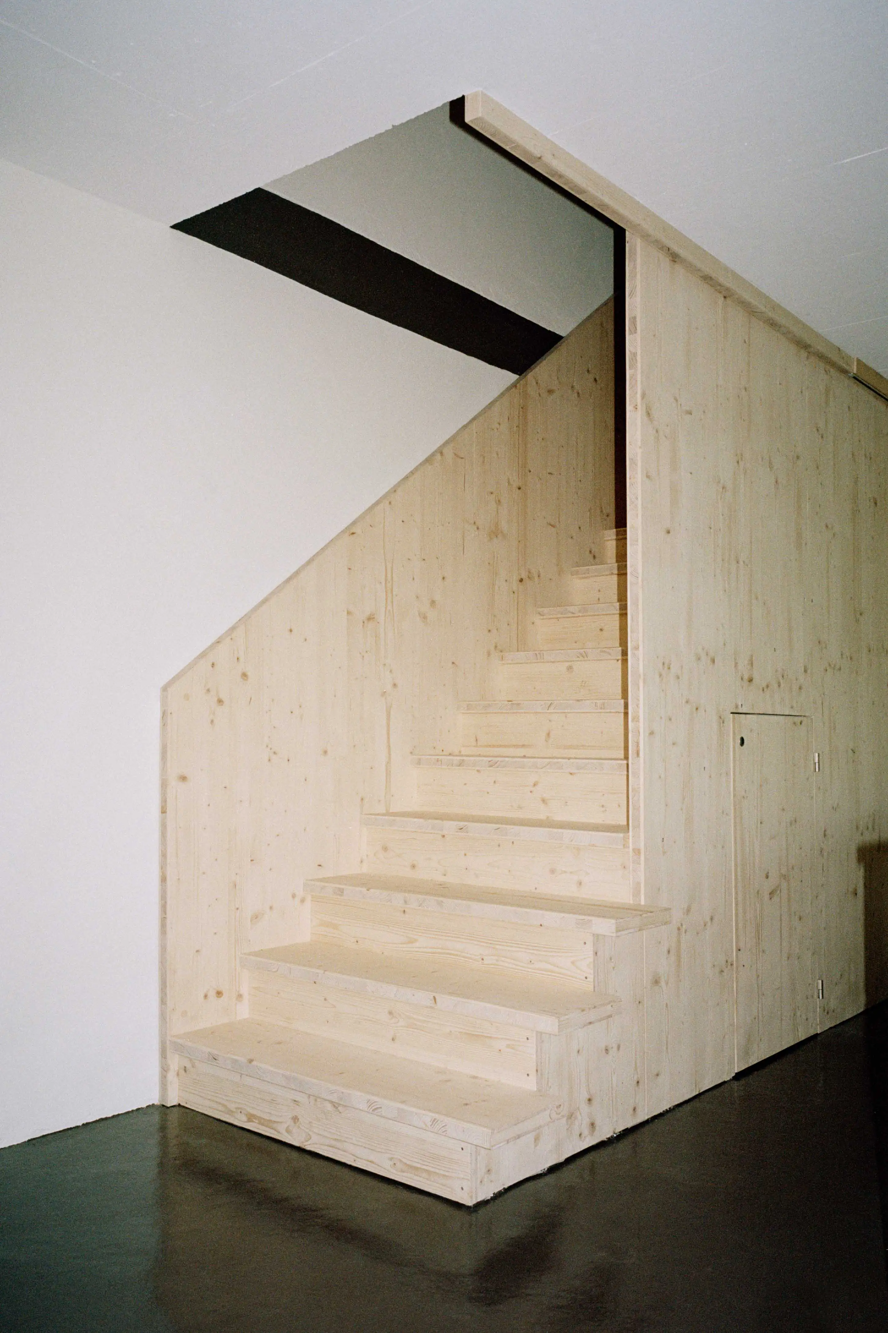 Über ein grosszügiges Eckfenster wird der Wohnraum mit dem Garten verwoben. Das aufgesetzte Fenster ist als minimale Loggia ausformuliert. Sie schenkt dem Haus einen Massstab, der mit der vernakulären Nachbarschaft bricht. Ein hölzerner Treppenturm schiebt sich der eingebauten Gebäudeecke entlang, vertikal durchs Haus. Ab dem Obergeschoss wechselt die Raumordnung – es entstehen Umläufe und Enfiladen.