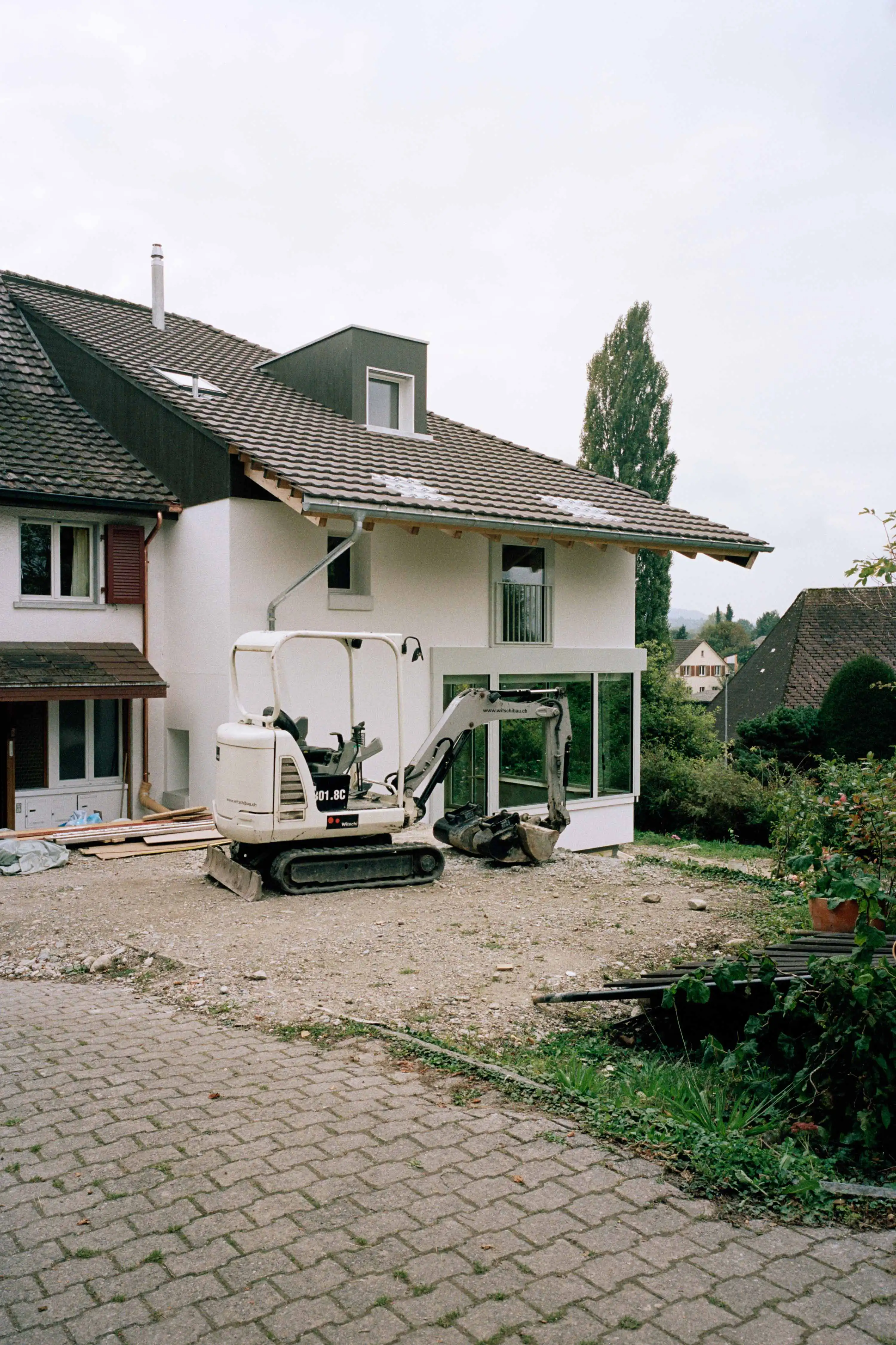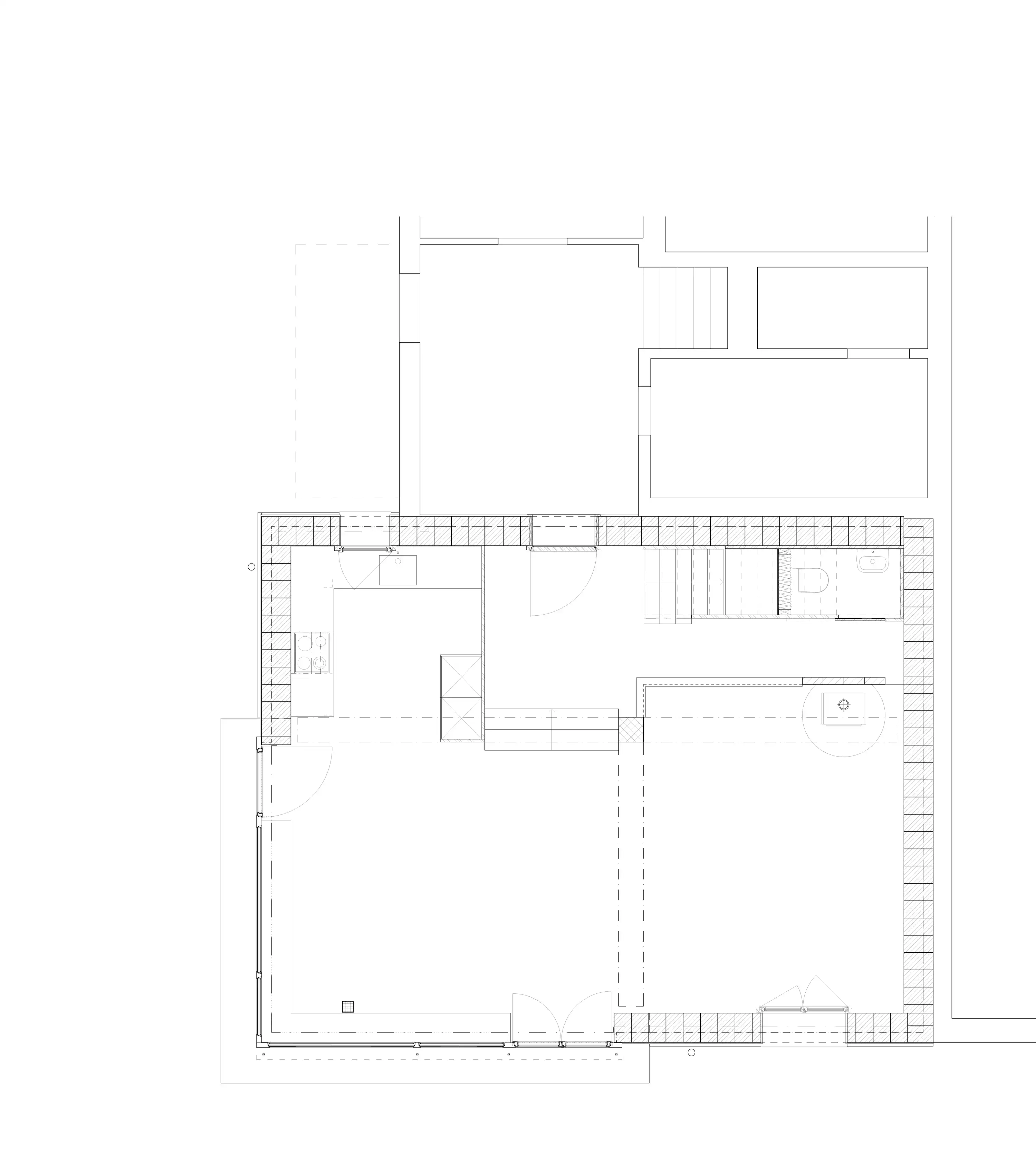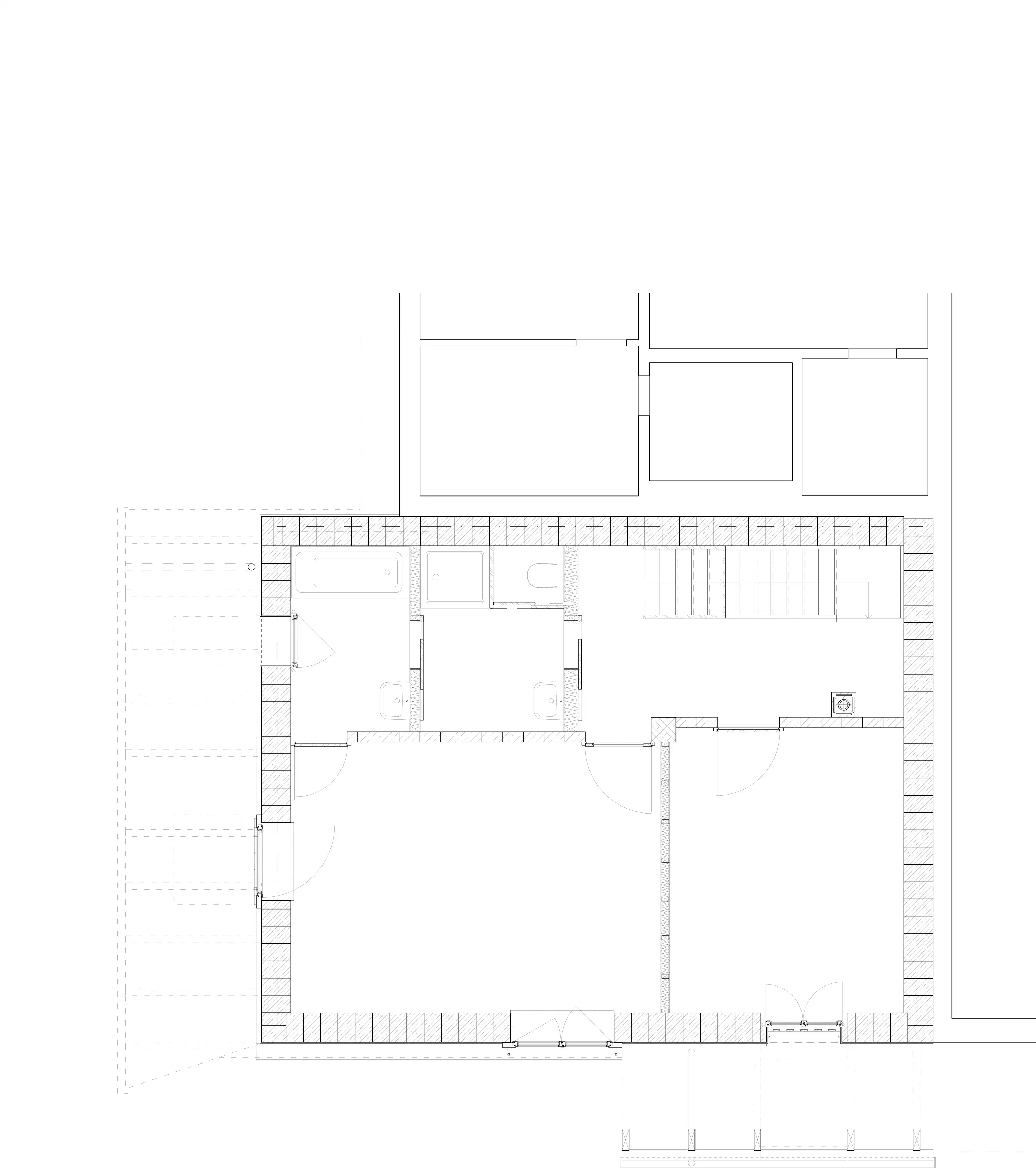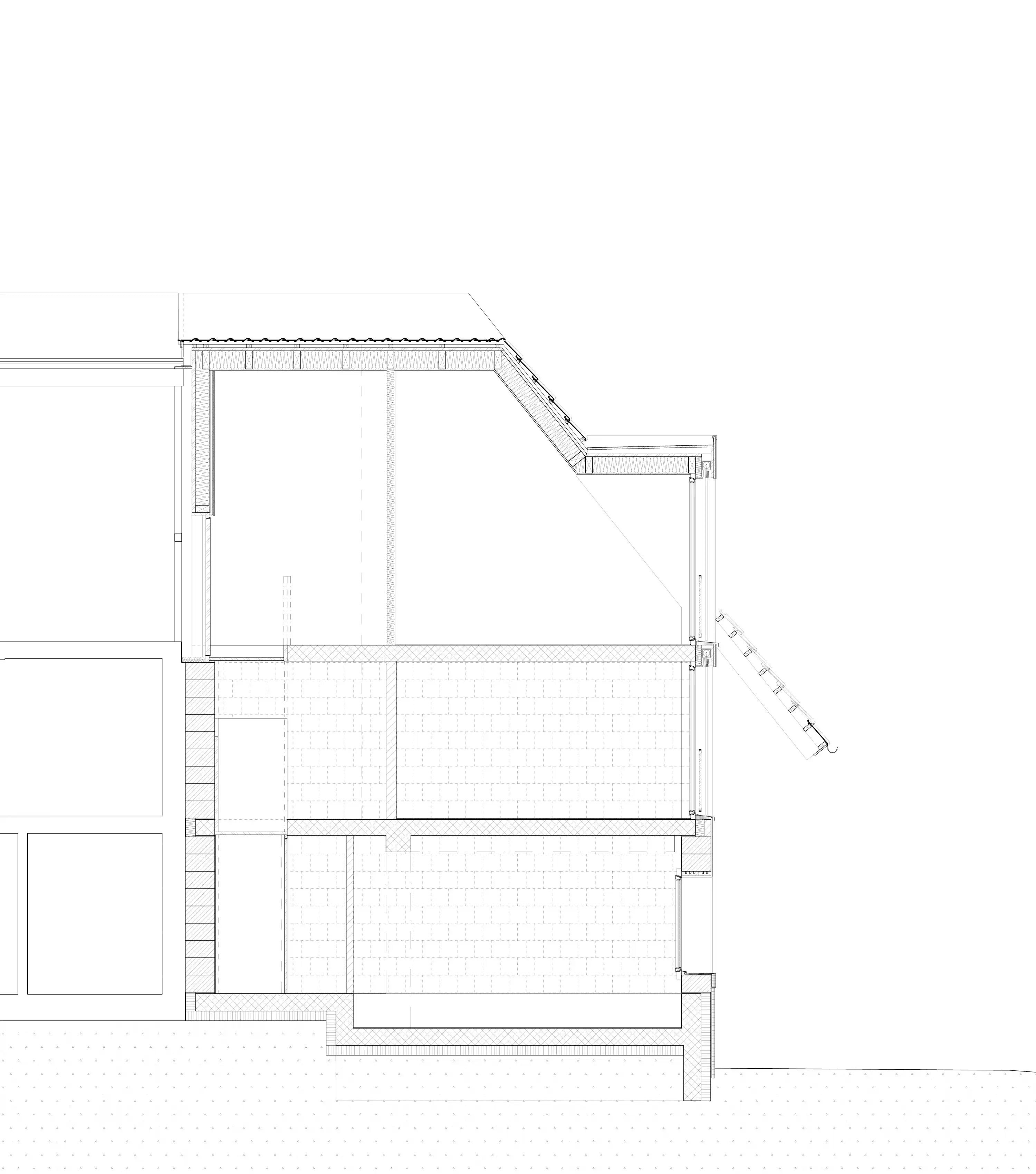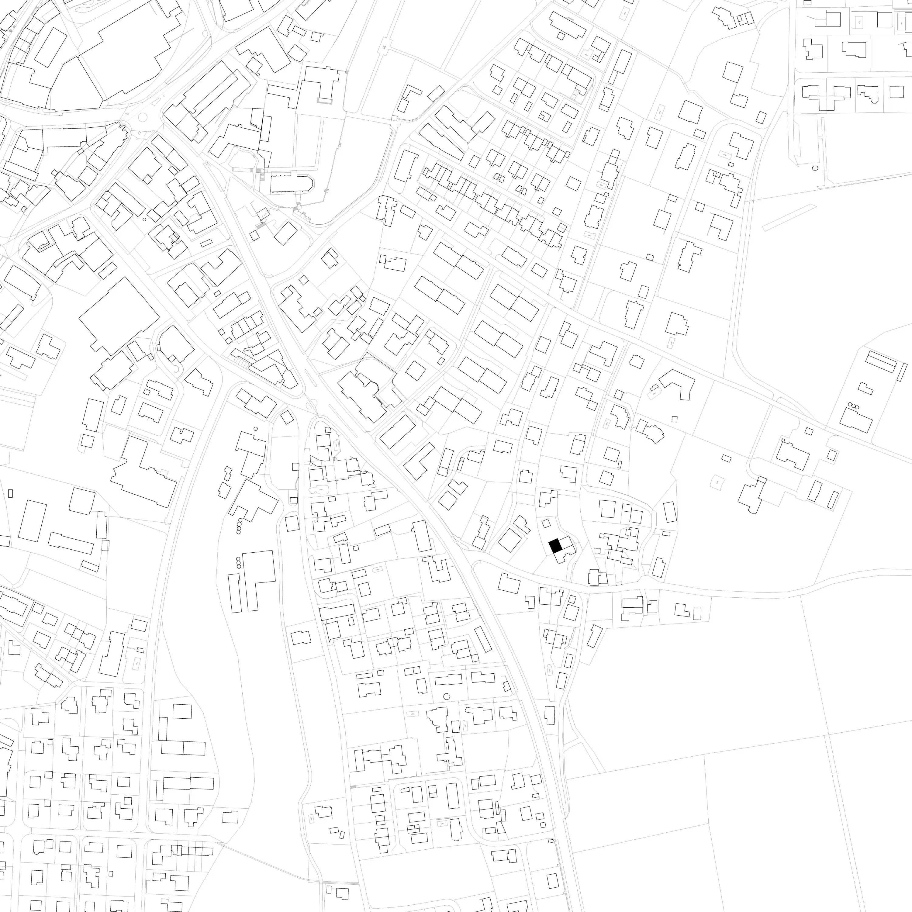 Über ein grosszügiges Eckfenster wird der Wohnraum mit dem Garten verwoben. Das aufgesetzte Fenster ist als minimale Loggia ausformuliert. Sie schenkt dem Haus einen Massstab, der mit der vernakulären Nachbarschaft bricht. Ein hölzerner Treppenturm schiebt sich der eingebauten Gebäudeecke entlang, vertikal durchs Haus. Ab dem Obergeschoss wechselt die Raumordnung – es entstehen Umläufe und Enfiladen.