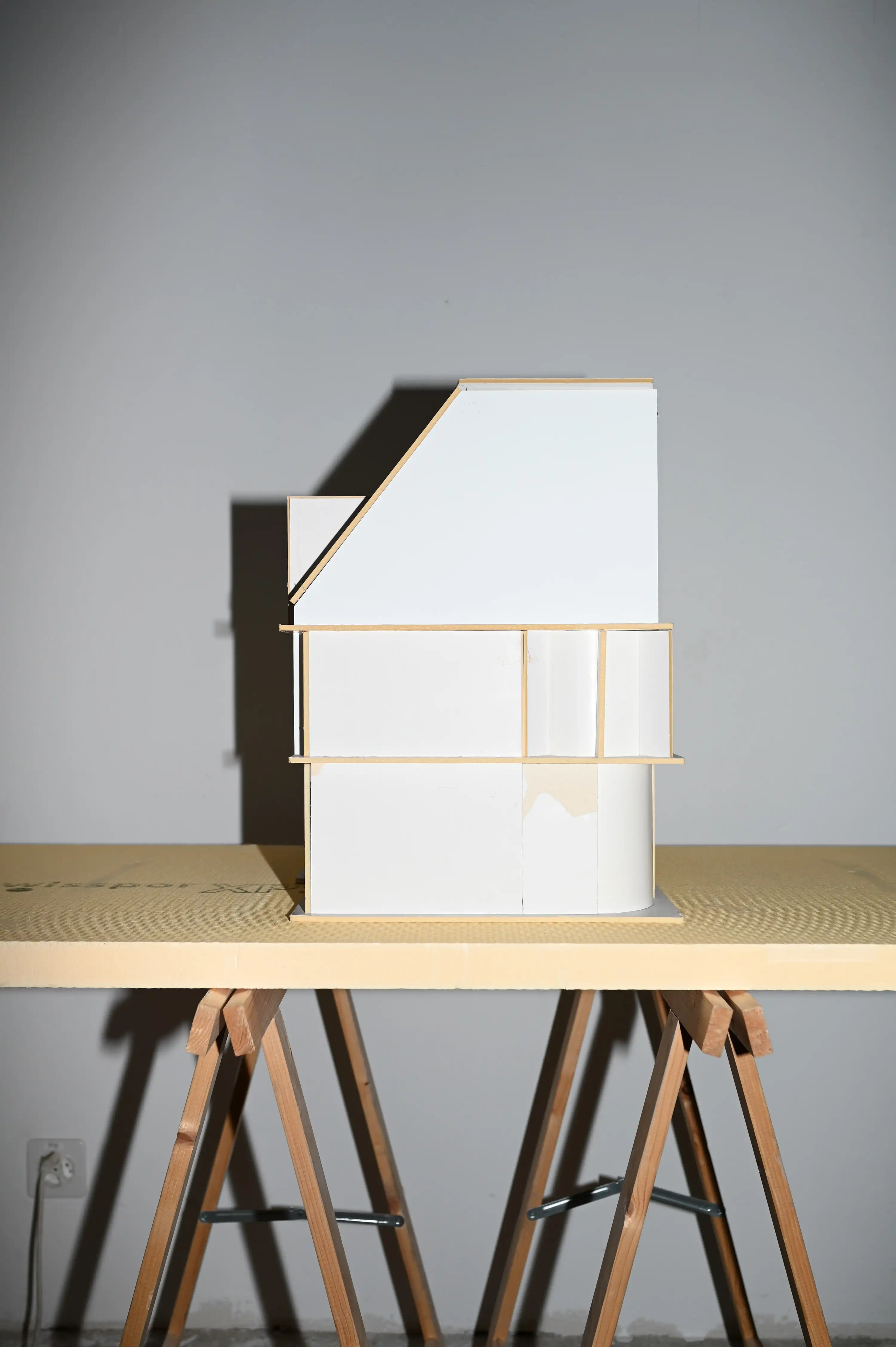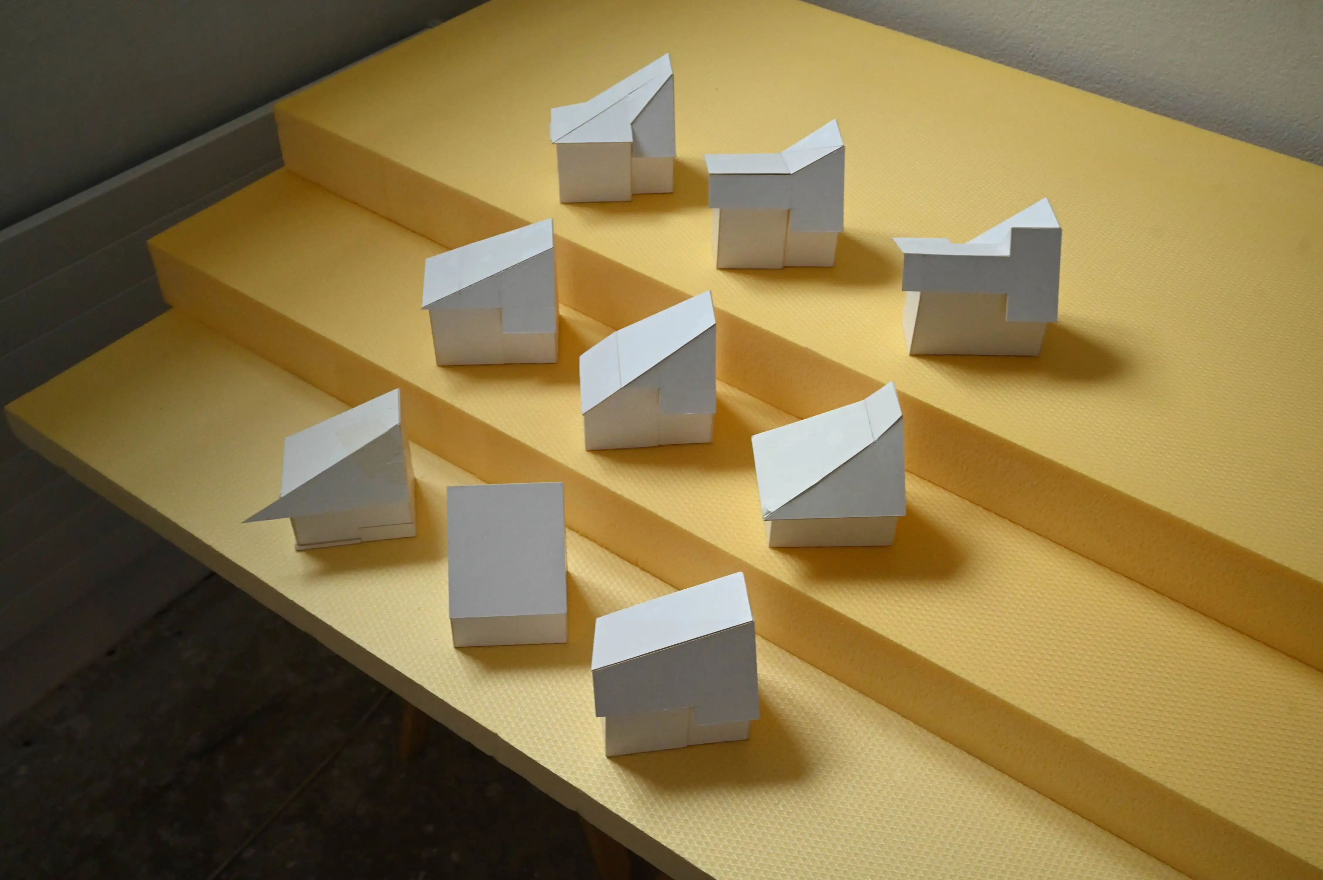 Der Entwurf für das kleine Wohnhaus ersetzt den Anspruch auf puristische Gleichheit durch Entwurfsprinzipien die aus alltäglichen, vitalen und heiteren Lebensgefühlen schöpfen. So trägt das Haus auch keine Krone, sondern einen schnittigen Hut.