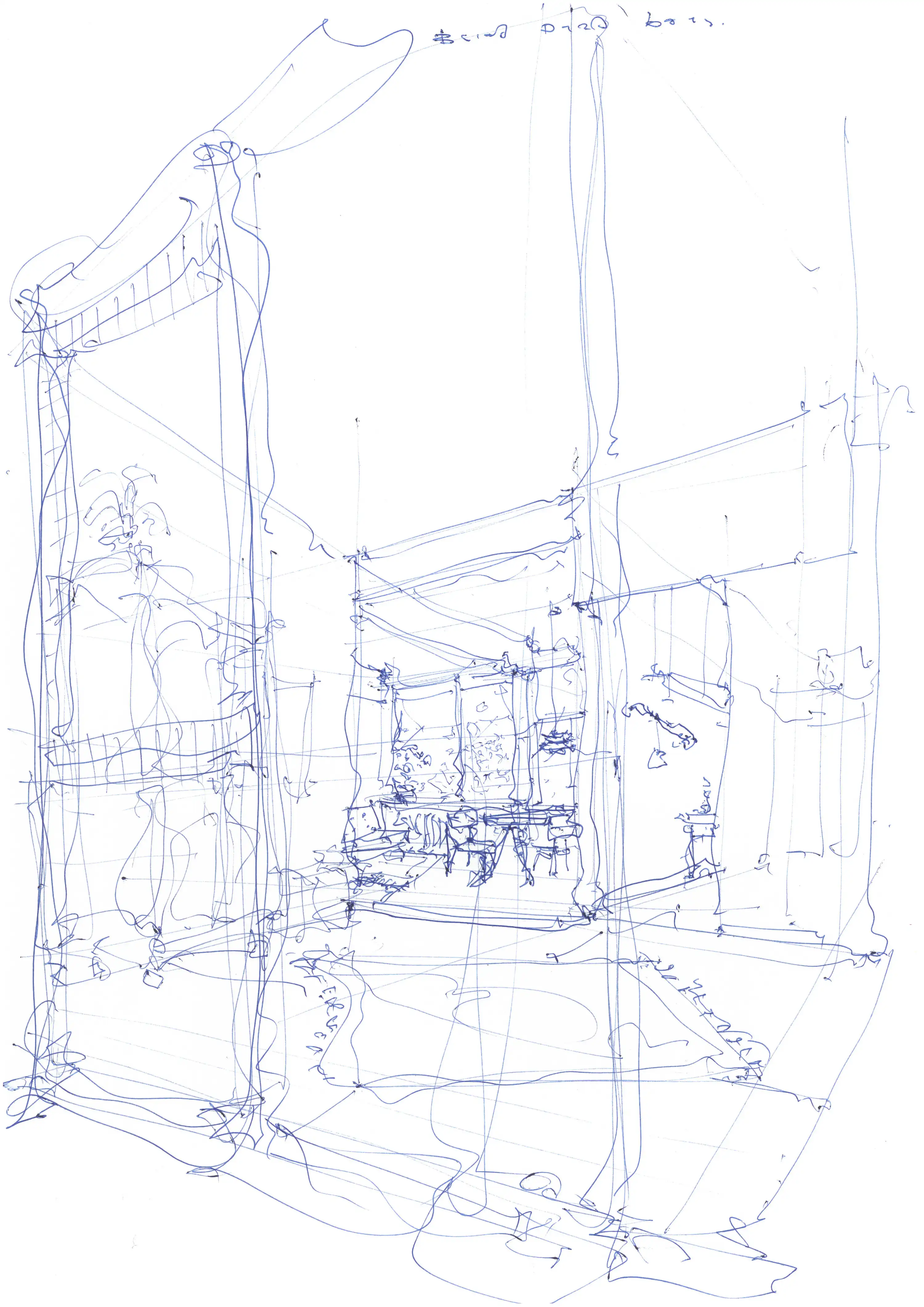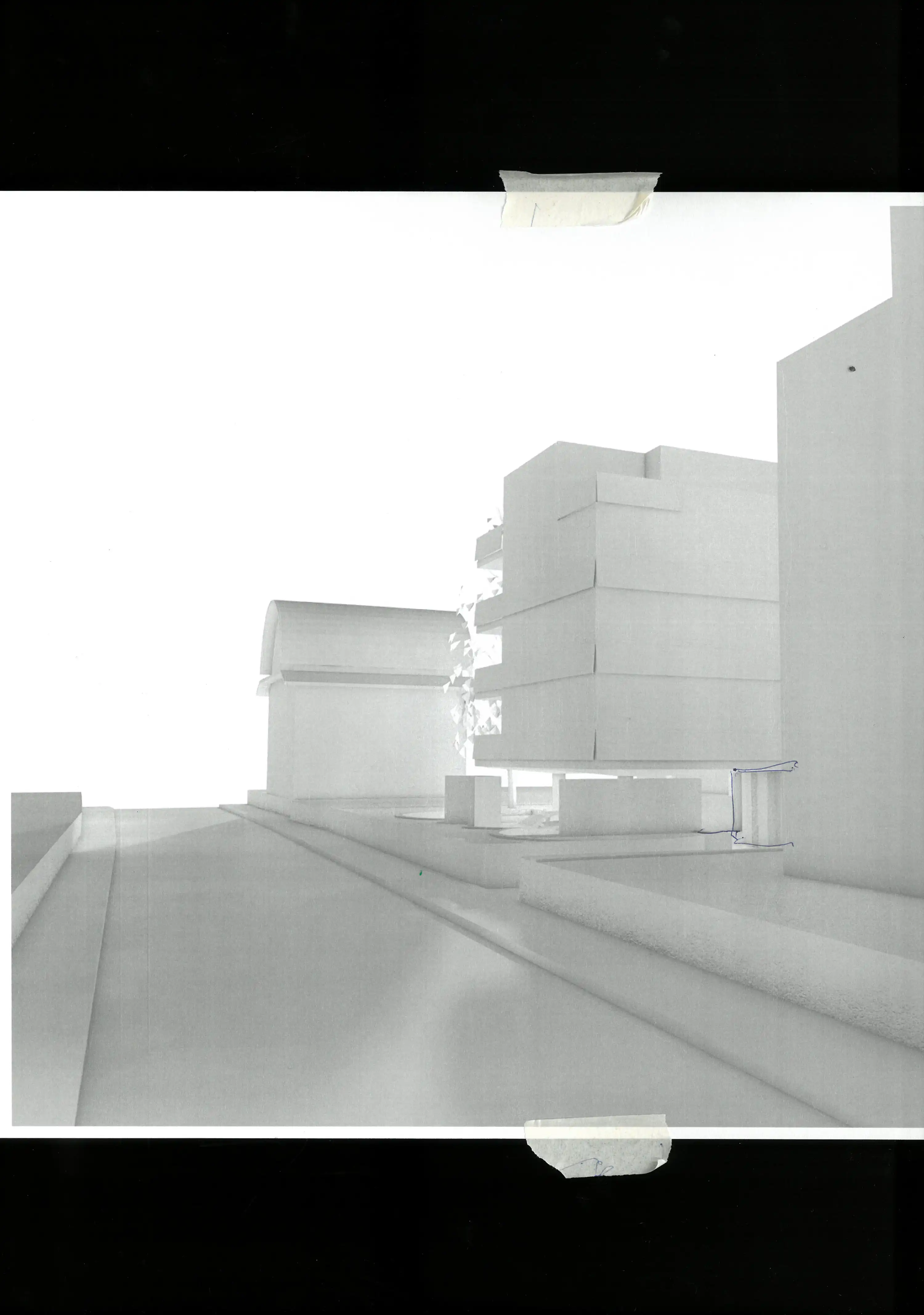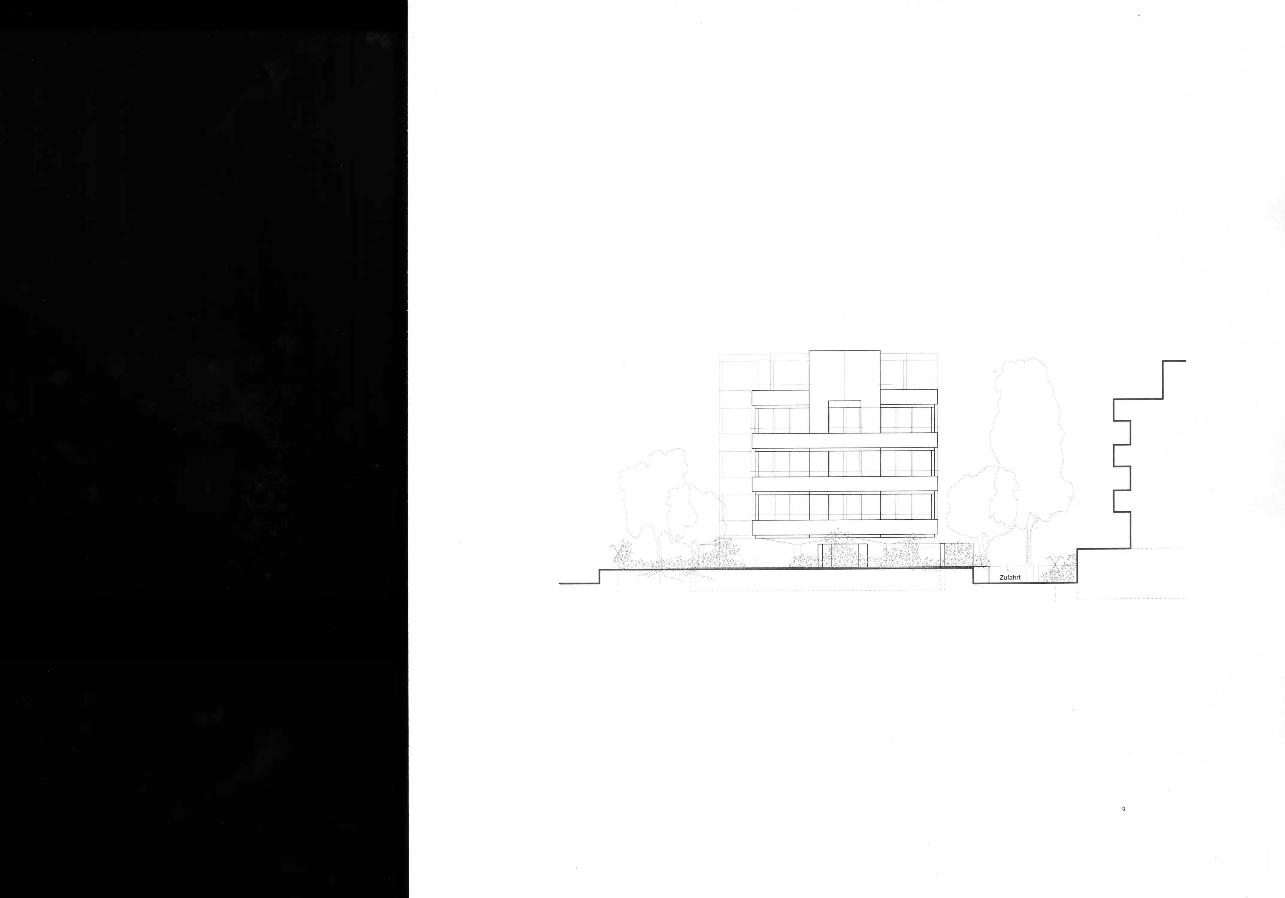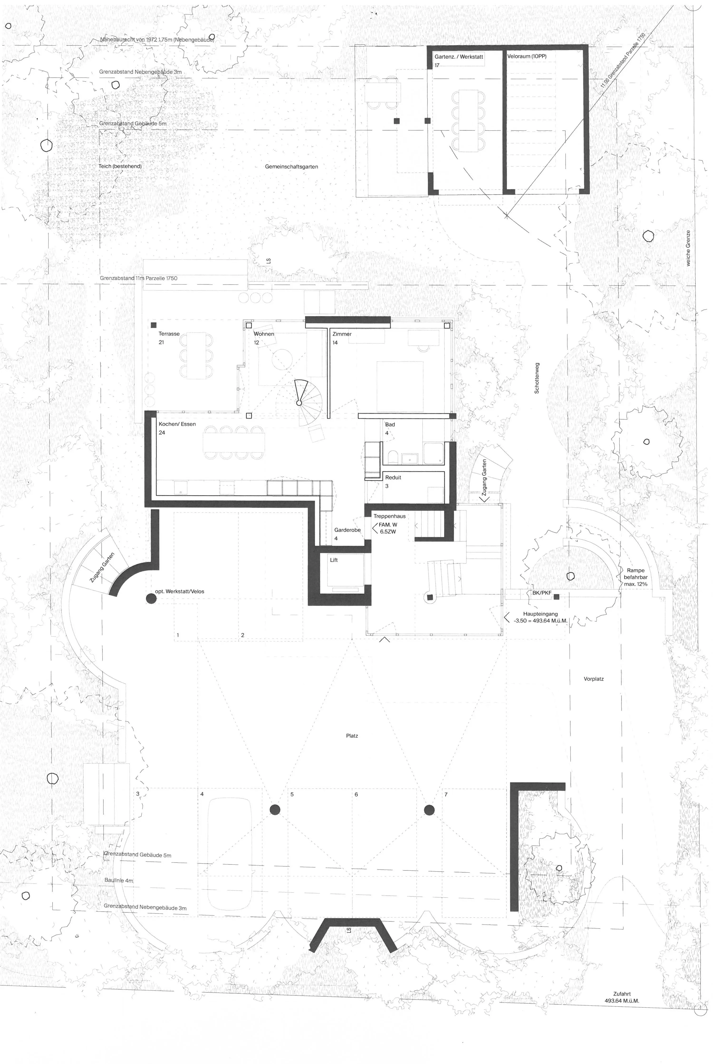 Anstelle einer Tiefgarage schlägt das Projekt einen offenen Parkplatz im Erdgeschoss vor. Aufgrund seiner Einbettung in die Gartengestaltung kann dieser ansonsten unterirdische, funktional eindeutige Raum, jederzeit zu einem atmosphärisch dichten Gemeinschaftsraum für alle Wohnungen umfunktioniert werden.