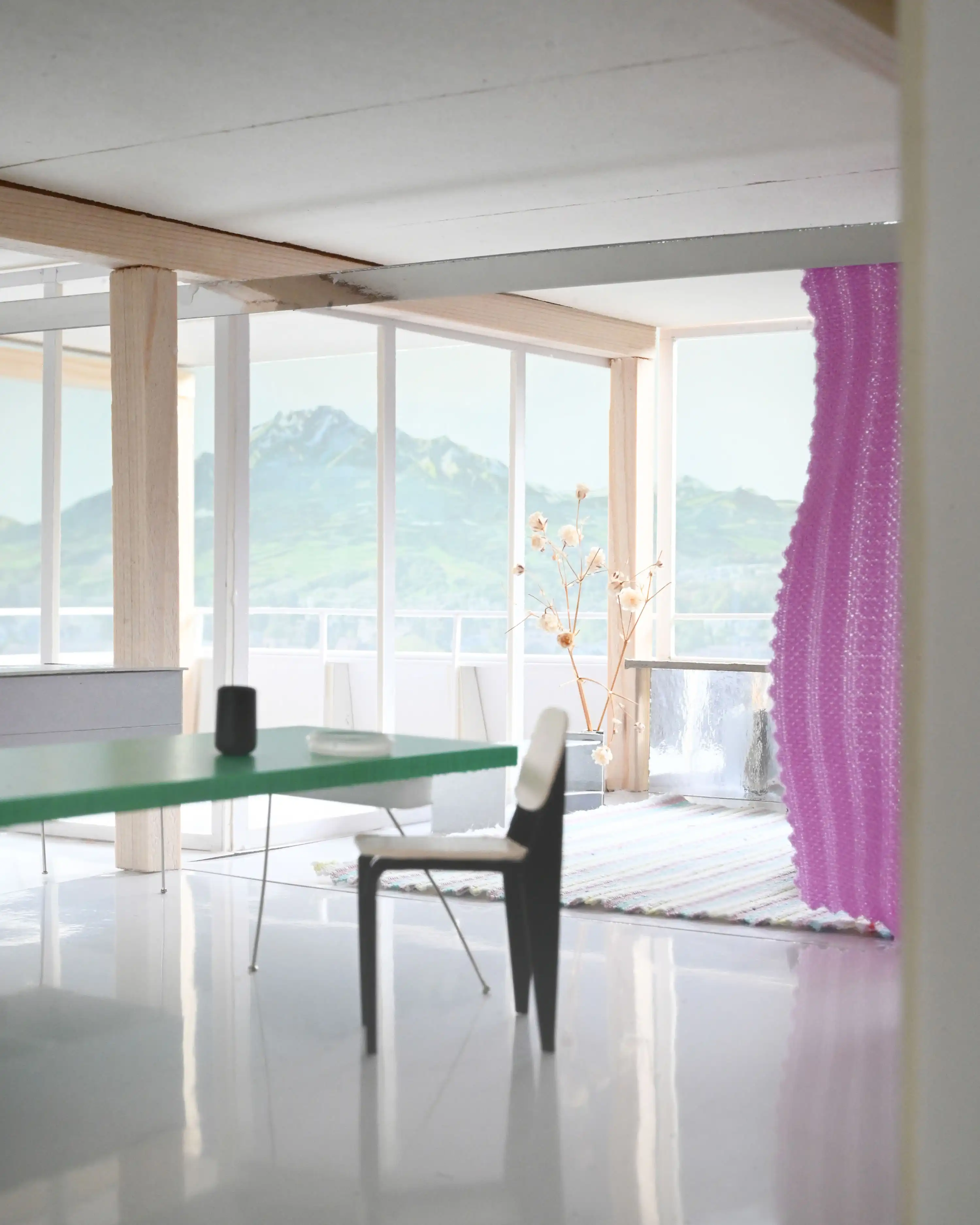 Grosse Türen und Fenster lösen den Kammergrundriss auf. Gewohnt wird entlang der Fassade und in der geräumigen, zentralen Wohnhalle.