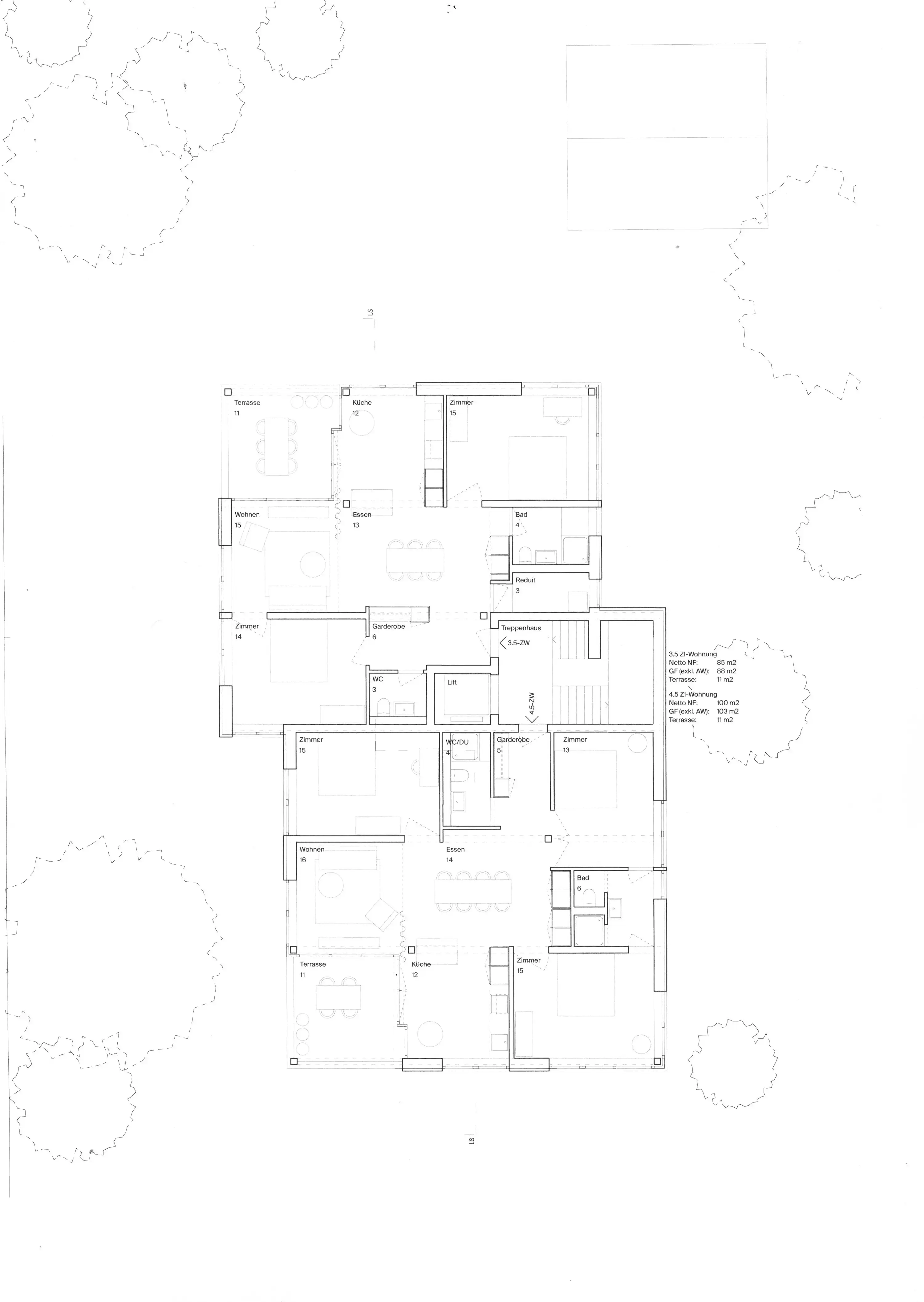 Die acht Wohnungen des Mehrfamilienhauses im Wesemlinquartier sind alle mehrseitig ausgerichtet. Die Aussichten auf die Rigi und den Pilatus werden kontrastiert durch eine enge räumliche Beziehung zum Garten. Während sich der vordere Teil des Wohnhauses in die Bebauungsstruktur entlang der Mettenwylstrasse einreiht, schöpft der von der Strasse abgewandte Teil des Wohnhauses aus dem Potenzial rückwärtigen, nachbarschaftlichen Grünraums.